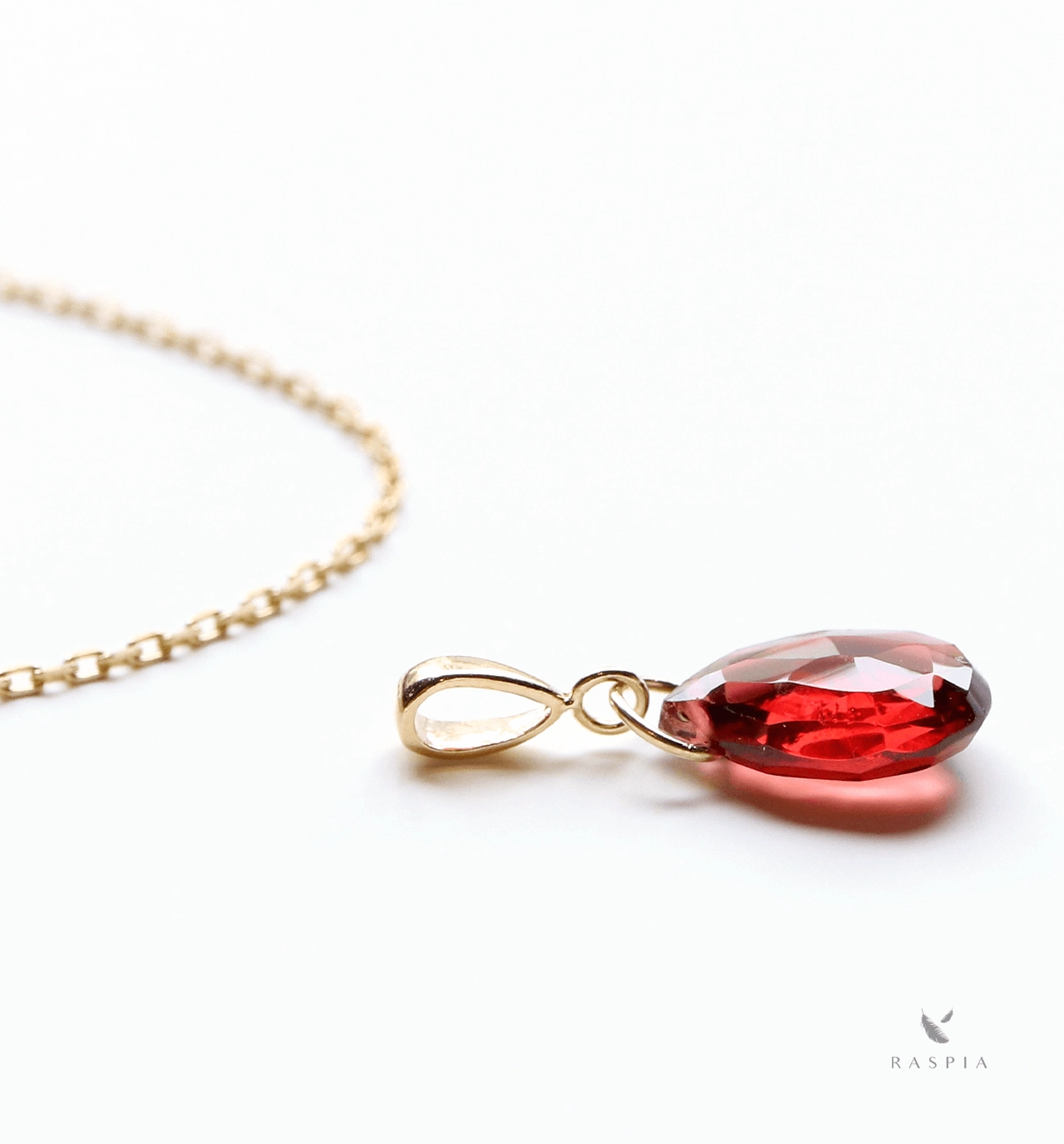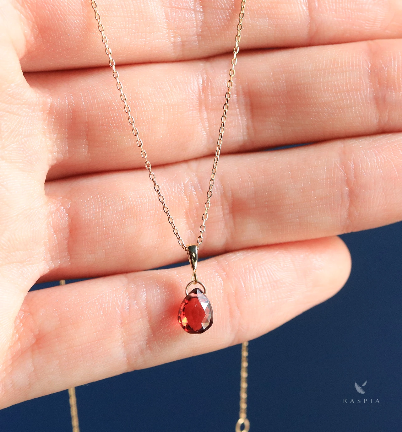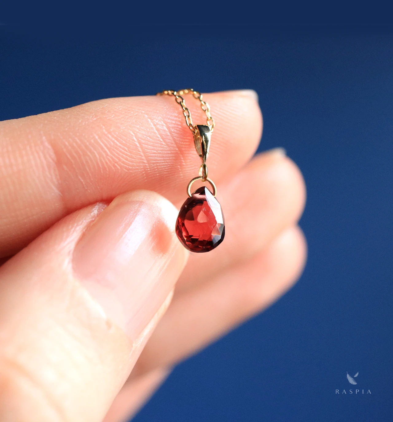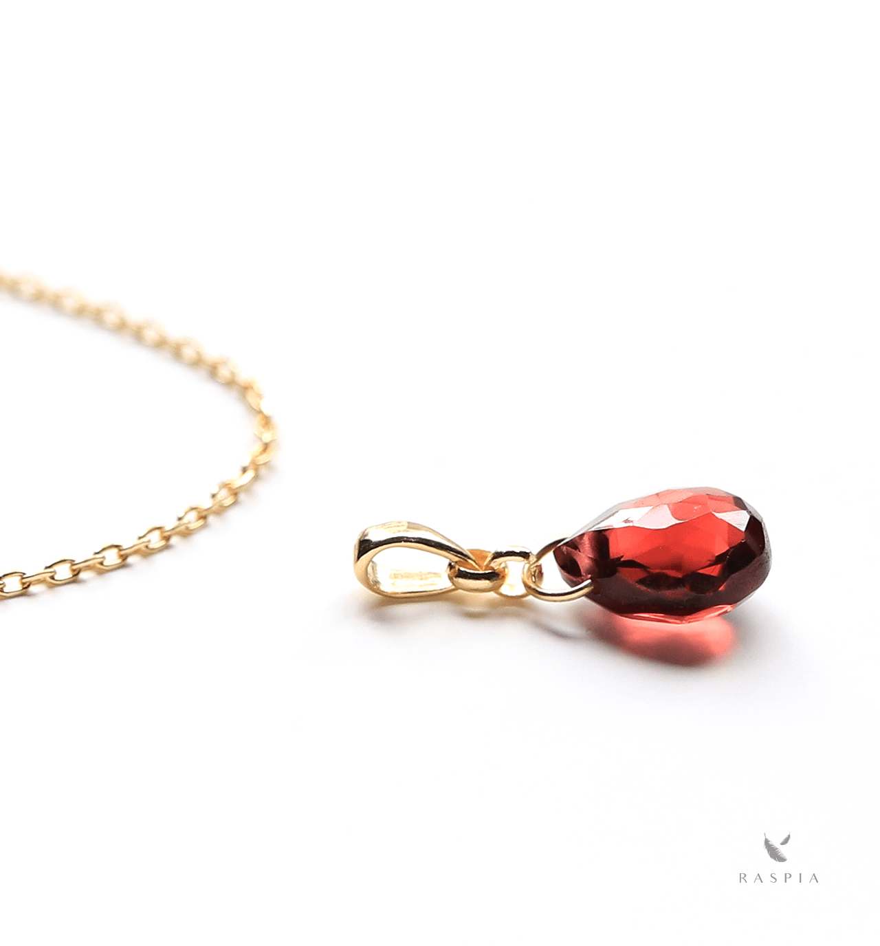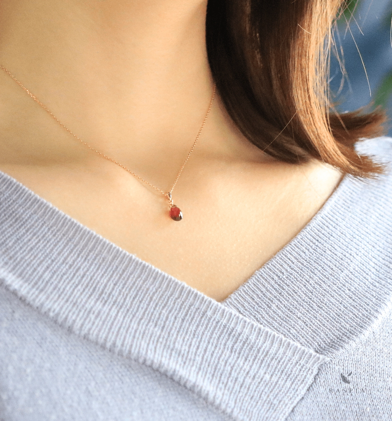 平ドロップのアルマンディンガーネットが胸元で確かな存在感を放ちます。金具は石の存在を引き立てるサイズ感にこだわりました。また、身体の動きに合わせ石が揺れてきらめき、それでいて石がいつも正面を向くように絶妙なバランス調整を施しています。