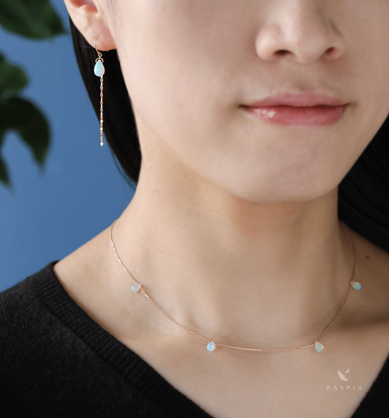 あずきチェーンに4石のオパールがついた特別なネックレスが、デコルテを飾ります。
