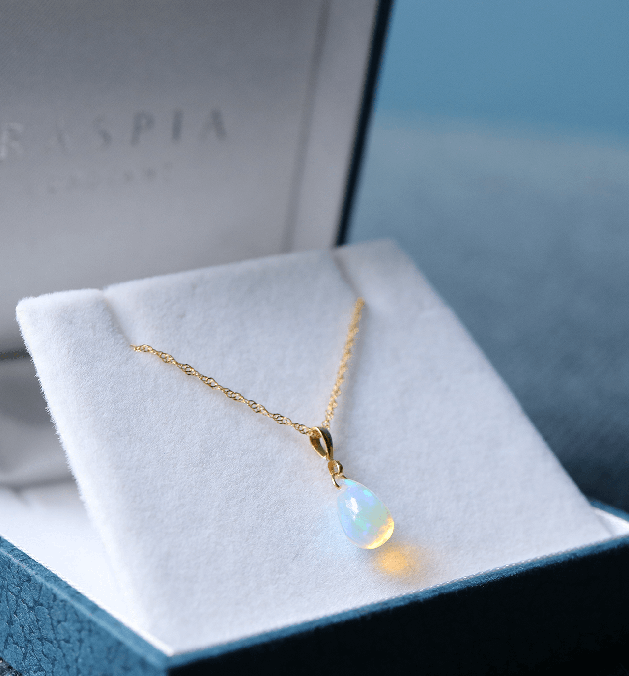 遊色効果が神秘的なウォーターオパールが胸元で確かな存在感を放ちます。金具は石の存在を引き立てるサイズ感にこだわりました。また、身体の動きに合わせ石が揺れてきらめき、それでいて石がいつも正面を向くように絶妙なバランス調整を施しています。