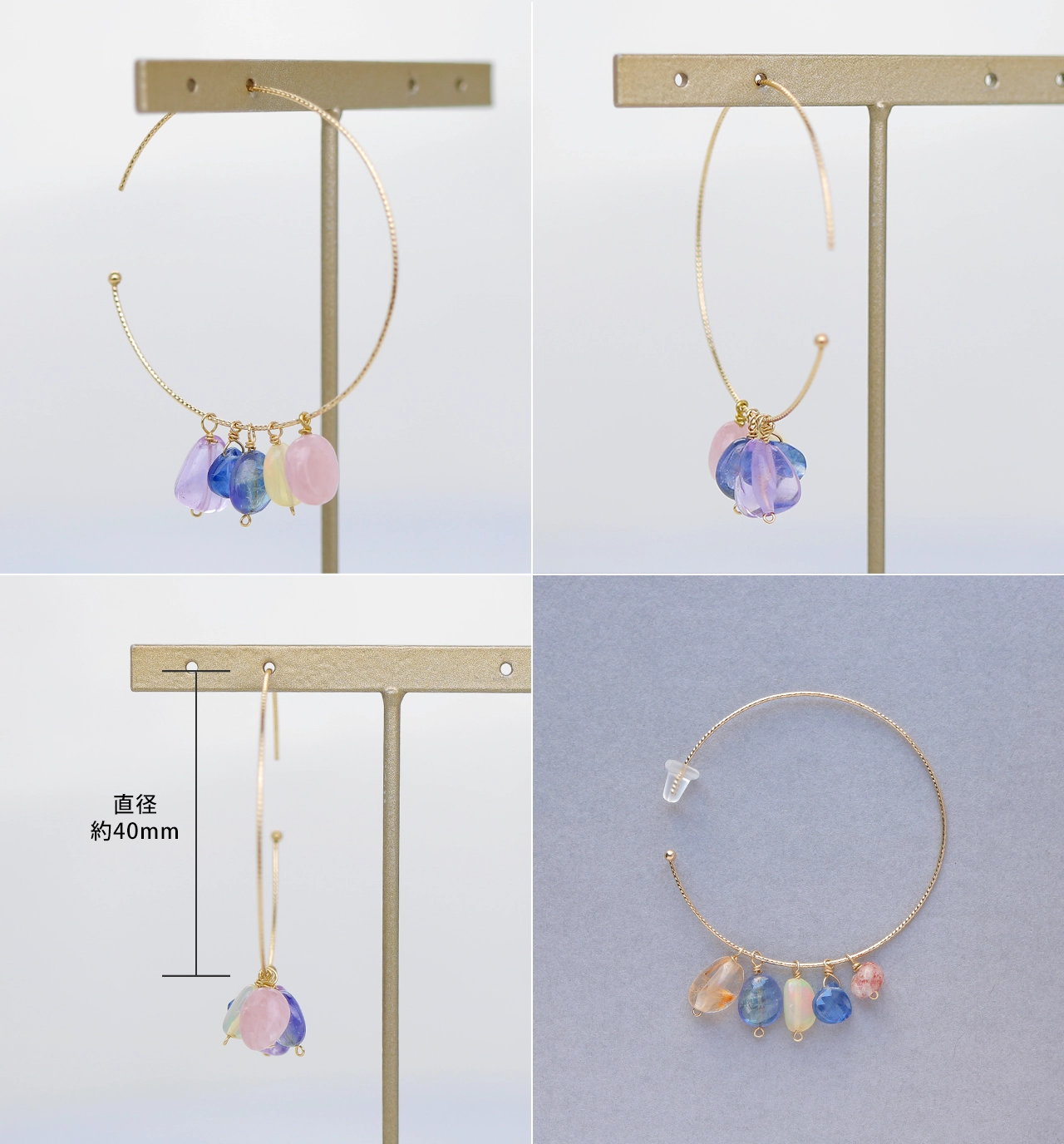 | サイズ | フープ直径:約40mm ポストの太さ:0.7mm チャーム:約3mm〜15mm前後(石によって異なります) | ||