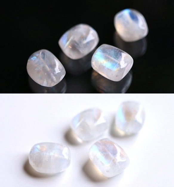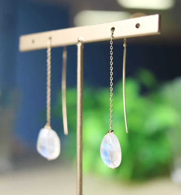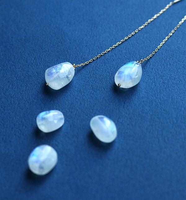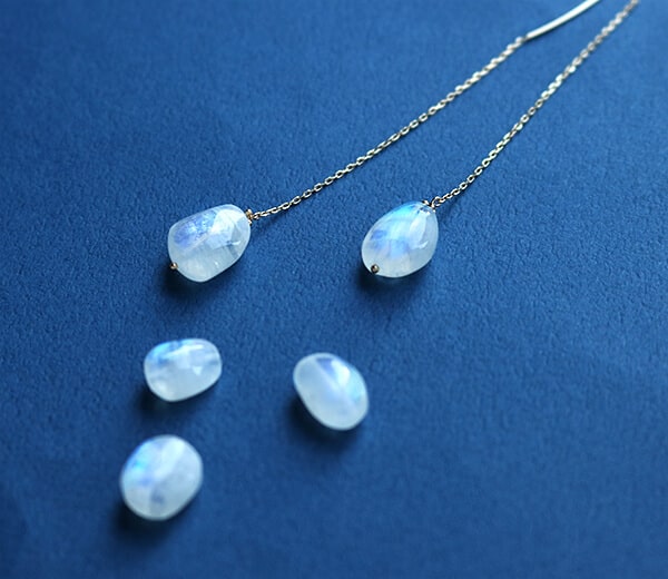 月の光を宿した石ムーンストーンのタンブルを使用したピアス。