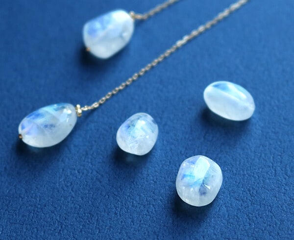 ムーンストーンを使用。 神秘的で儚い輝きと乳白色の石が織りなす独特の透明感が人気のムーンストーン。 古代から世界各地でこの石は月の光が封印されていると考えられ、聖なる石とされてきました。 数多くの伝承が有る偉大なパワーを秘めたパワーストーンです。 6月の誕生石としても有名です。 「恋人たちの石」「愛を伝える石」ともいわれるムーンストーンには愛のエネルギーが満ち溢れています。 愛する人との出会いや恋愛成就、結婚など幸せな未来に導いてくれるこの石は大切な人への贈り物にもぴったりな宝石です。 また、女性性の象徴の石なので女性を優しく傍で見守りサポートしてくれる石でもあります。 この石を身につけることで情緒が不安定になったときもそっとあなたに寄り添い心を平和に鎮めてくれるでしょう。