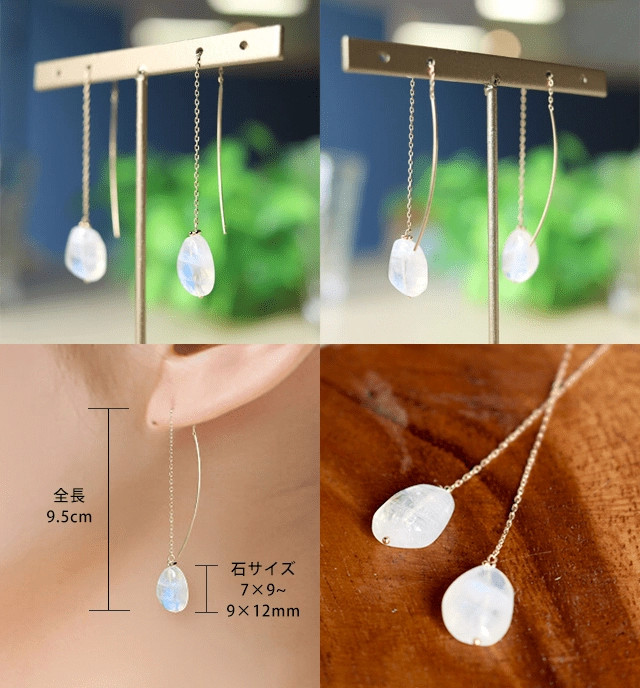| サイズ | 全長:約9.5cm(石の大きさにより長さは変動) ムーンストーン:最小7×9 〜 最大9×12mm ポストの太さ:0.8mm | ||
