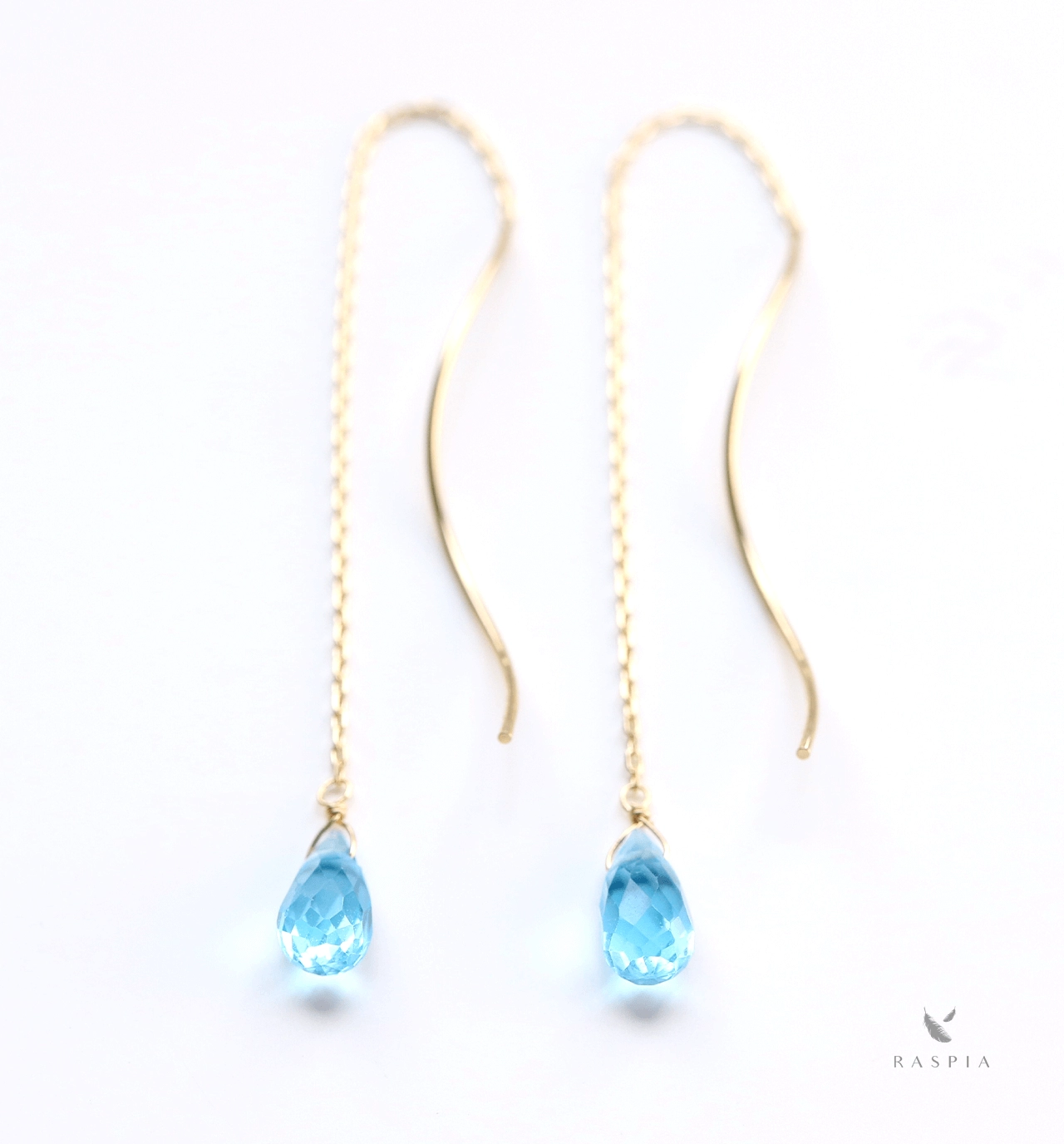 石が主役の繊細な曲線が美しいアメリカンチェーンを使ったイエローゴールドピアス。スイスブルーと呼ばれる濃く鮮やかなブルーとトパーズ特有の強い煌めきが極細の10金チェーンと調和。石の魅力が最大限に引き立つようにしました。