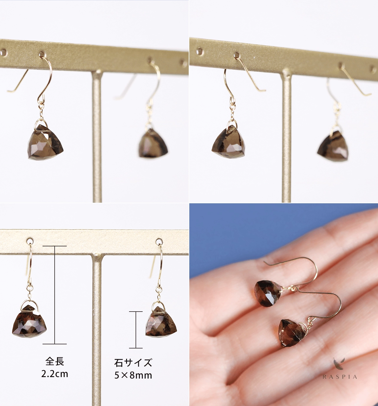 | サイズ | 【ピアス】サイズ:縦 約14mm×横 約10mm フックの太さ 0.5mm【石】スモーキークォーツ:一辺約8mm | ||