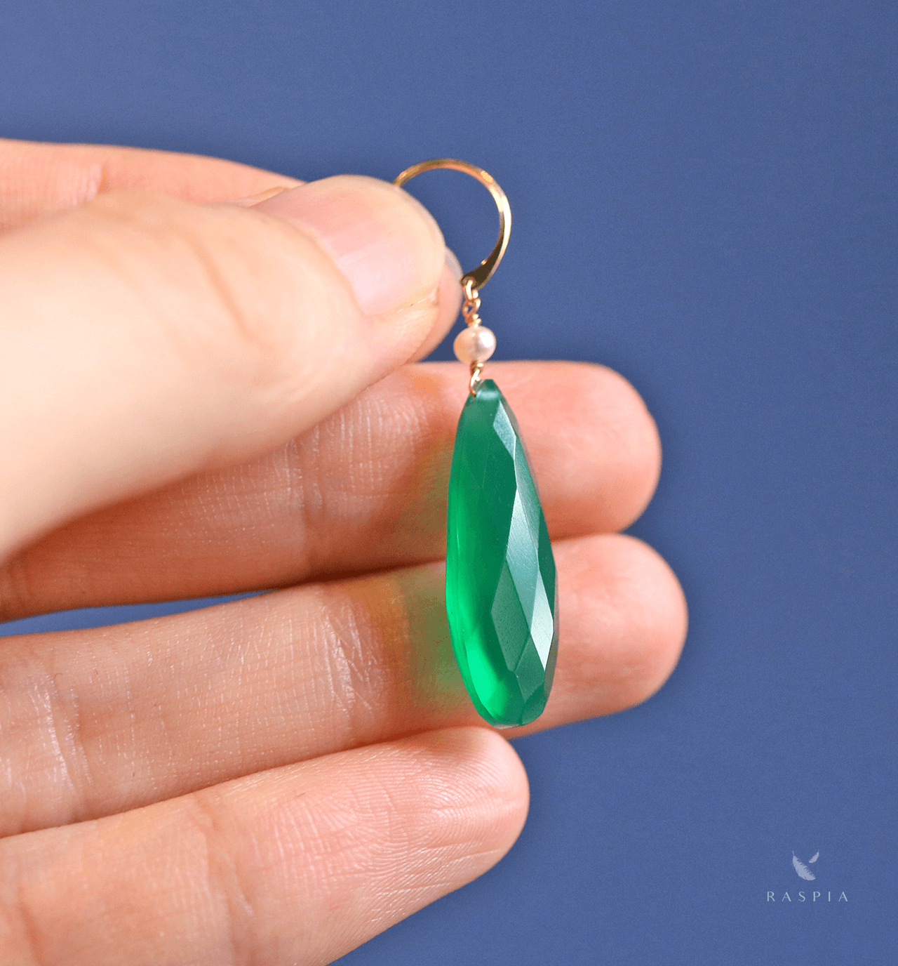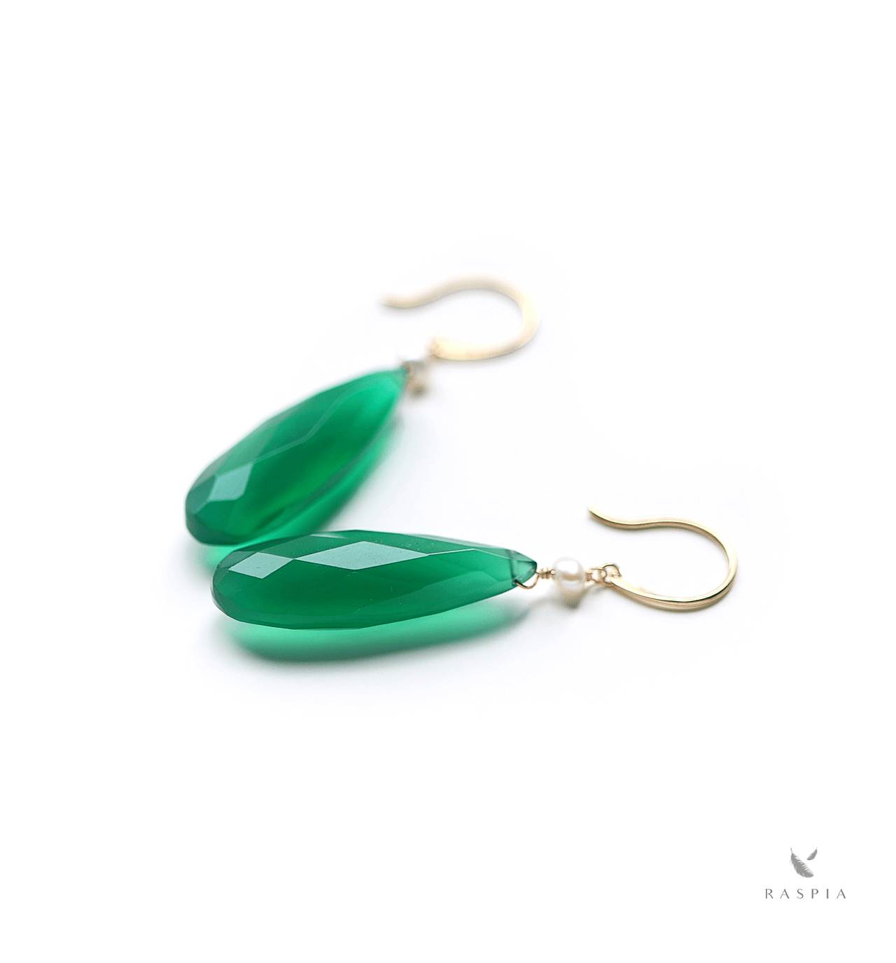 シャープな曲線とバランスが美しいフックピアスの形。存在感のあるロングペアシェイプの半透明で新緑のような鮮やかなグリーンが清々しいグリーンオニキスが上品な色合いを優美に演出します。