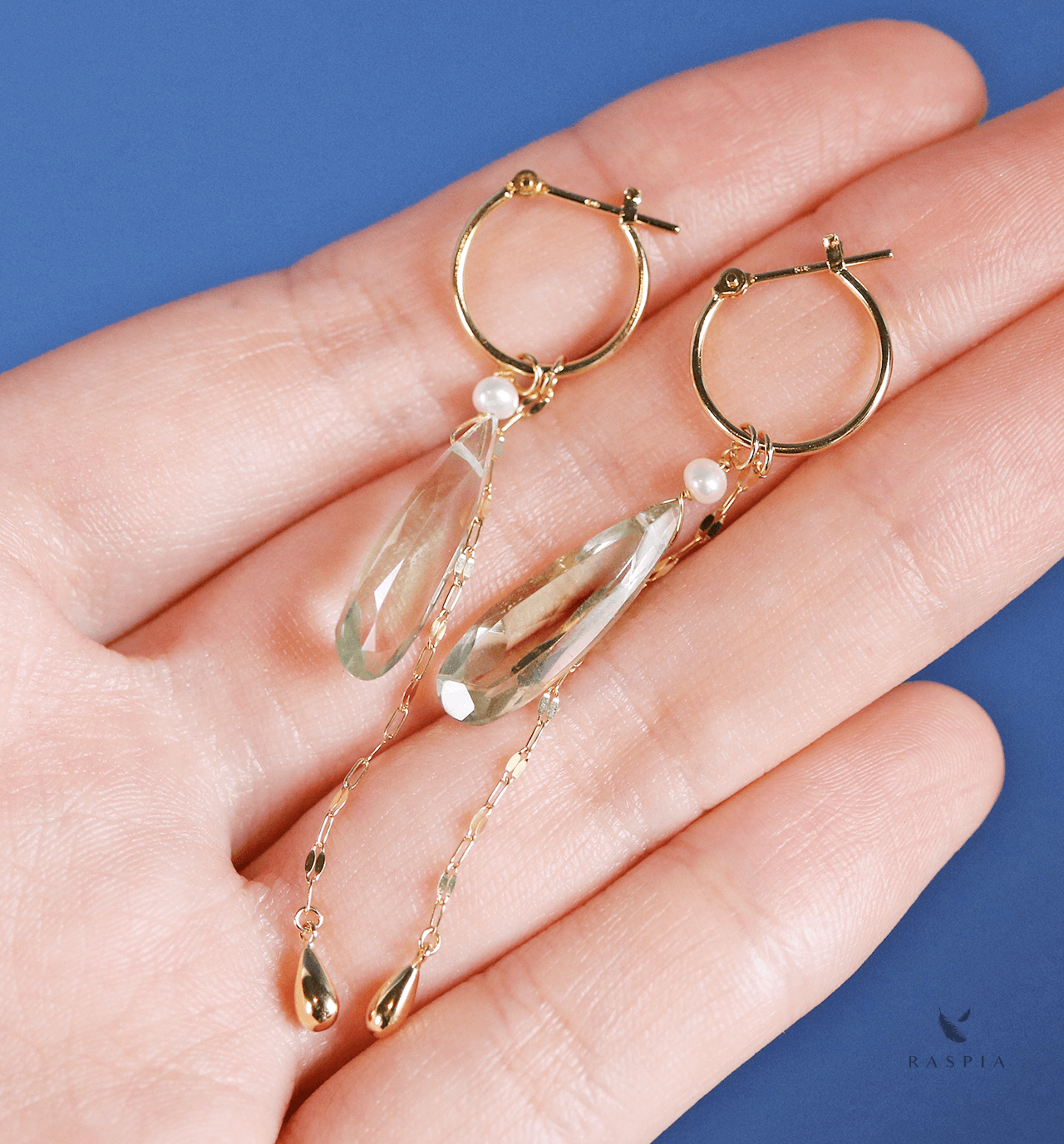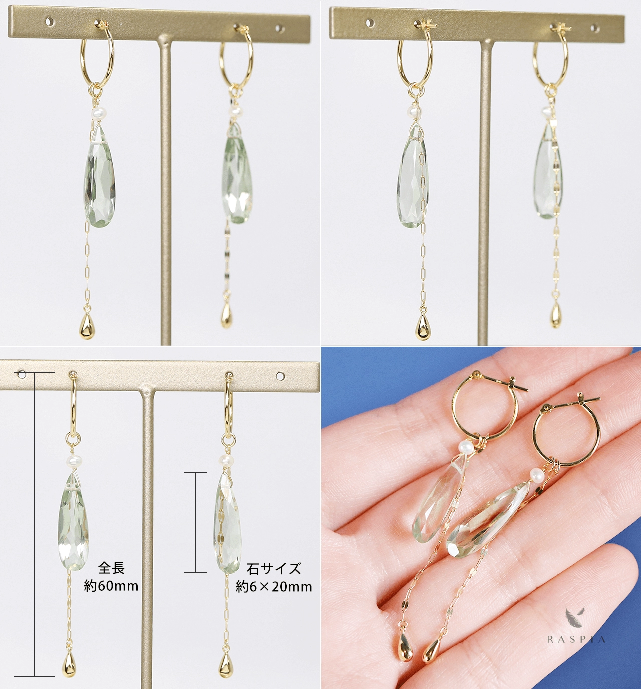 縦長のグリーンアメジストとチェーンが耳元で揺れるたびに軽やかに煌めきます。また、鮮やかなイエローゴールドと清々しい色のグリーンアメジスト、そしてさり気なくあしらわれた淡水パールは相性がよく、上品な可愛らしさを演出してくれます。