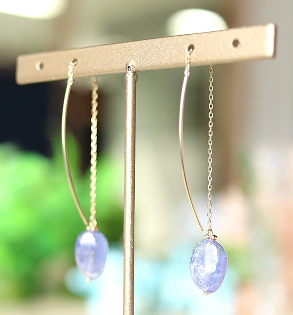 アメリカンピアスはK10イエローゴールドを使用し、タンザナイトが持つ独特の青をより引き立ててくれます。黄色と青紫の色合わせは神秘的な魅力を醸し出します。