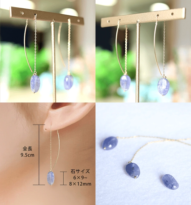 | サイズ | 全長:約9.5cm タンザナイト:最小6×9mm 〜 最大8×12mm ポストの太さ:0.8mm | ||