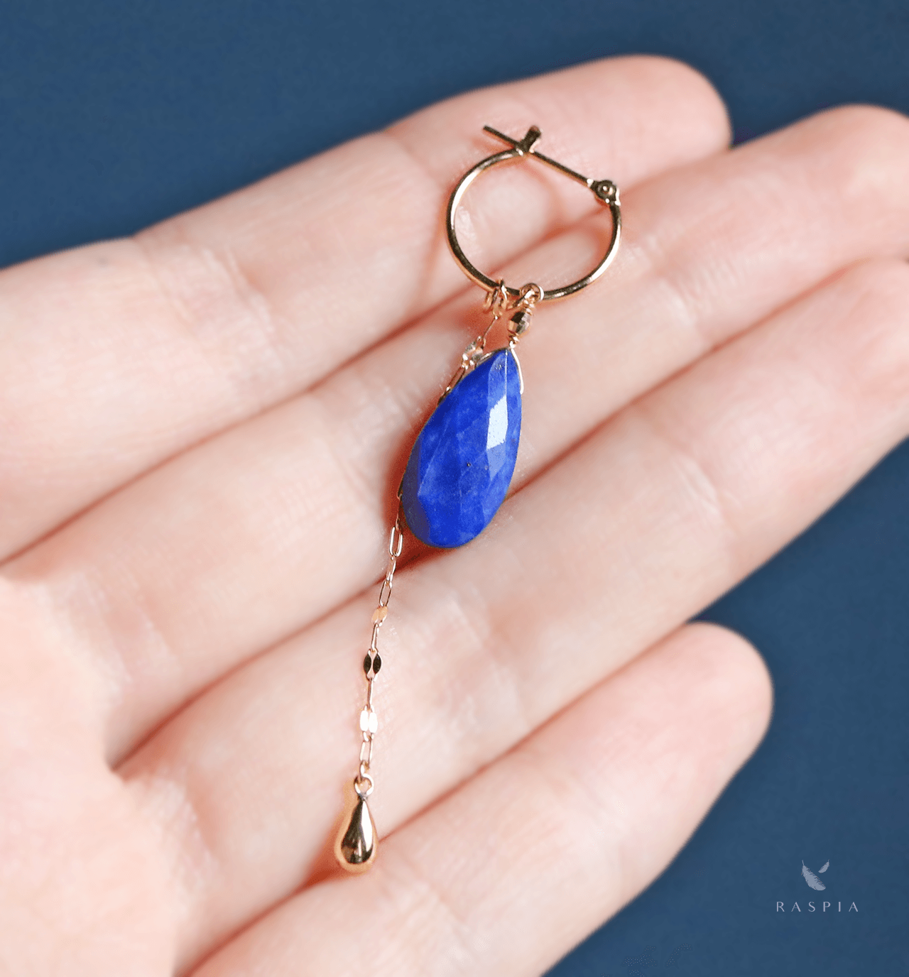 ラピスラズリの深い青とのコントラストの美しさが最大限に引き立つようにしました。散りばめた星が夜の空に広がるような綺麗なラピスラズリ、そしてさり気なくあしらわれたK18のカットビーズは相性がよく、上品で可愛く耳元で揺れます。