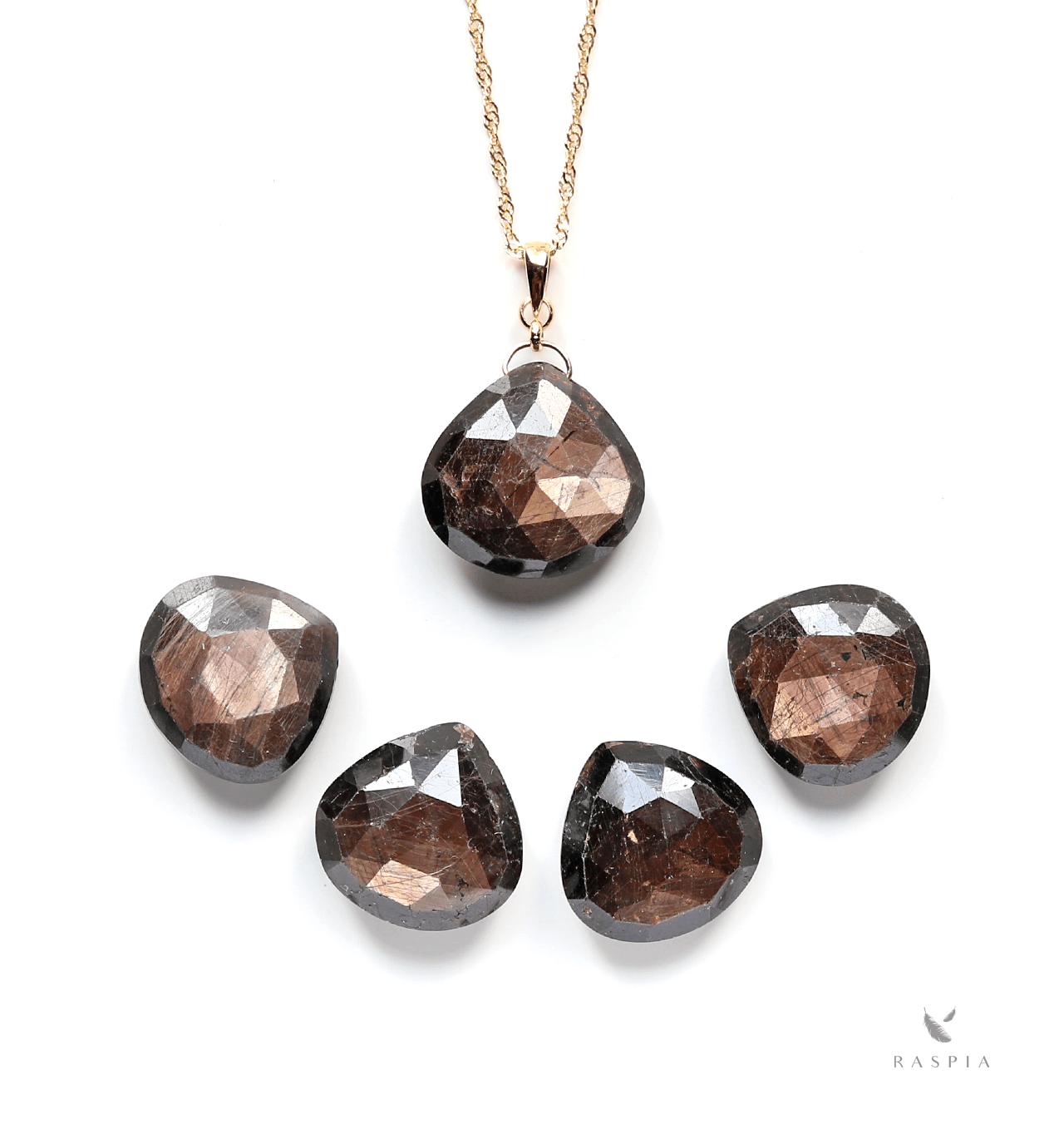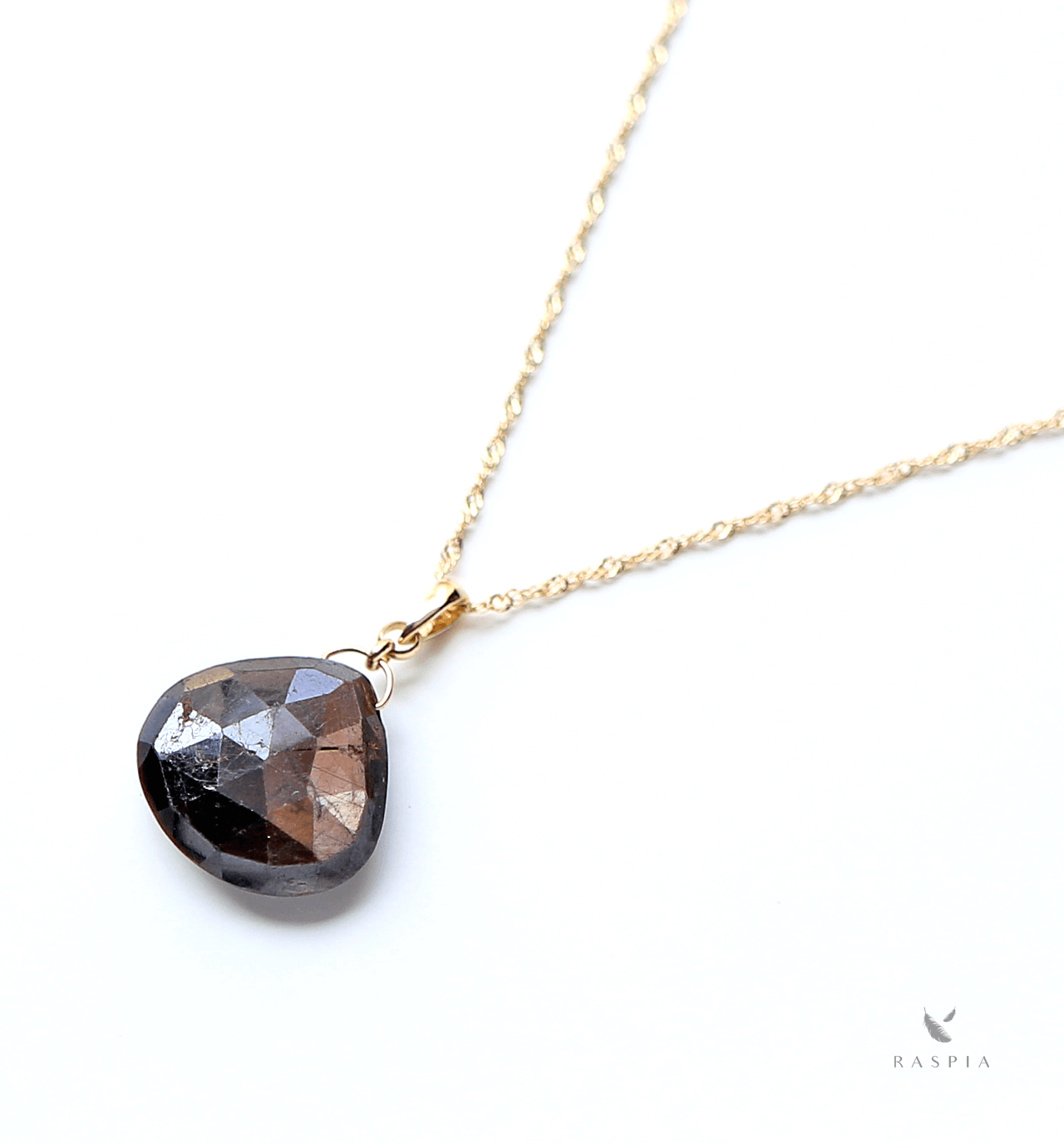 シックなブラックカラーをベースに落ち着いたブラウンに輝くシラーが美しい、マダガスカル産のゴールデンブラウンカラーのサファイアを使用したネックレスチャーム。
