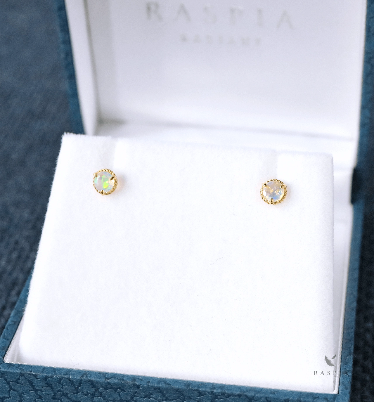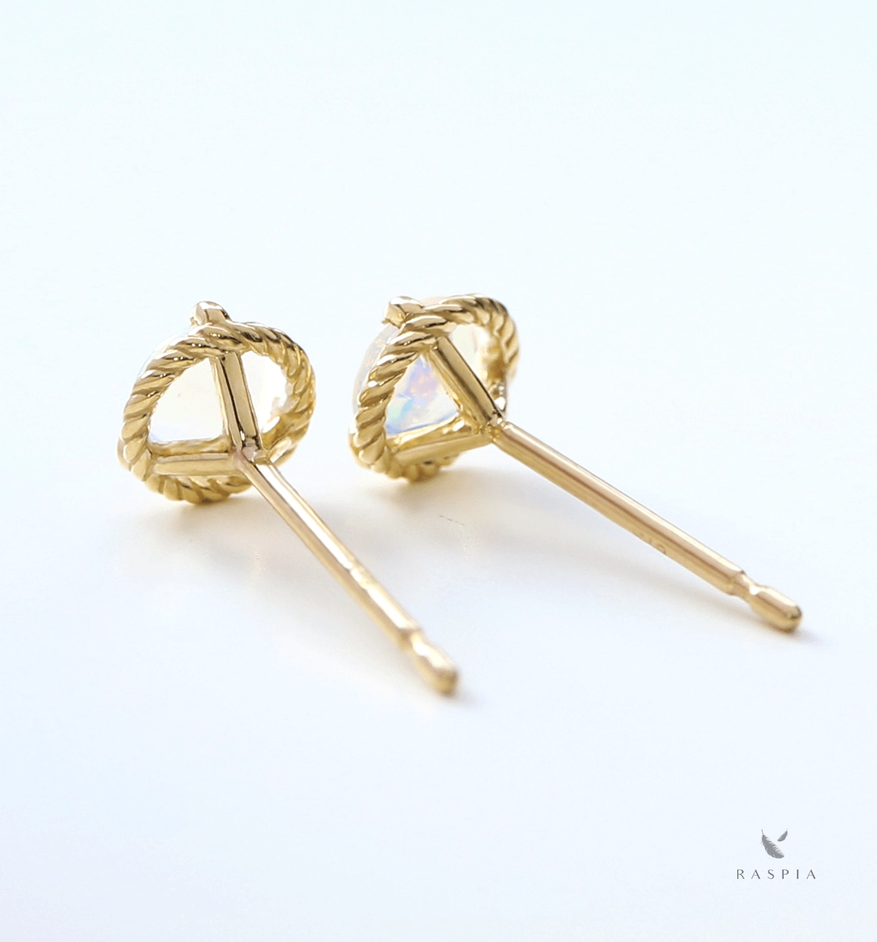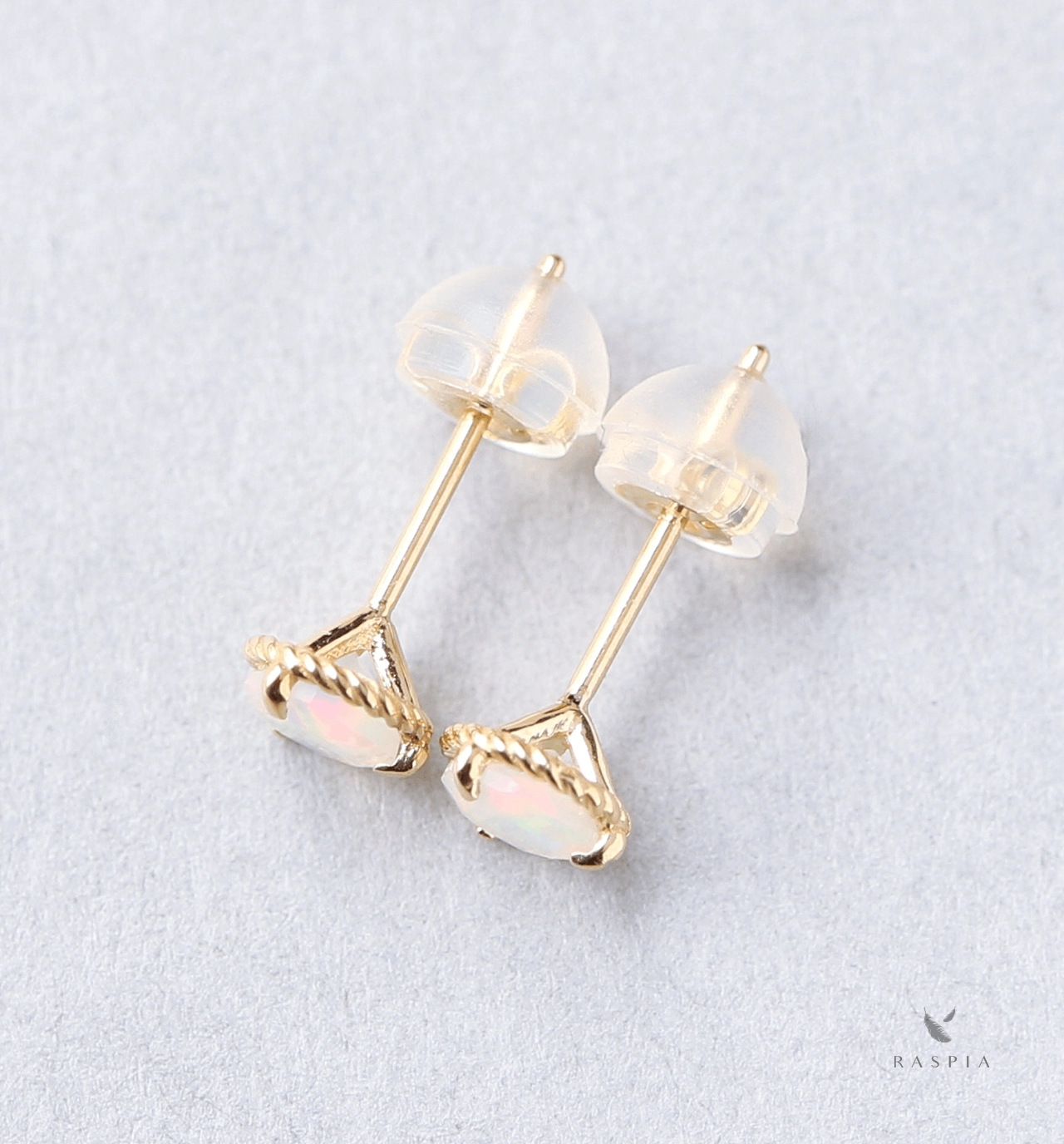 彩り鮮やかな遊色が魅力的なエチオピア産プレシャスオパール。ラウンドにファセットカットを施したオパールを18金のヨリ線の縁取りの台座にシンプルなピアスに仕立てました。