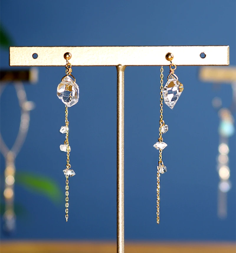 ハーキマーの特徴の天然のカットから生まれる透明感のある輝きを、より一層引き立たせるため2種類のゴールドを使用しています。 前に大きい一粒ハーキマーを使用し、後ろのキャッチ部分には流れ落ちるように小粒のハーキマーを配置することで遠近感や物語性を演出しています。