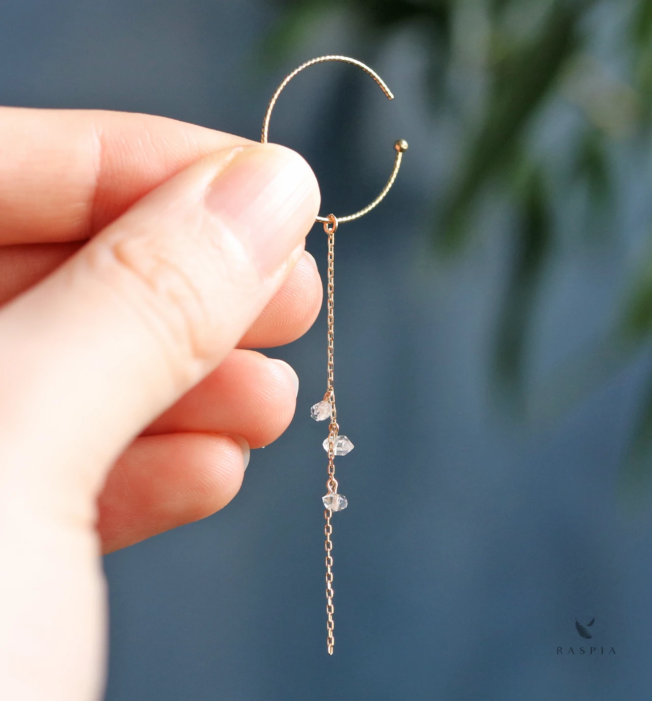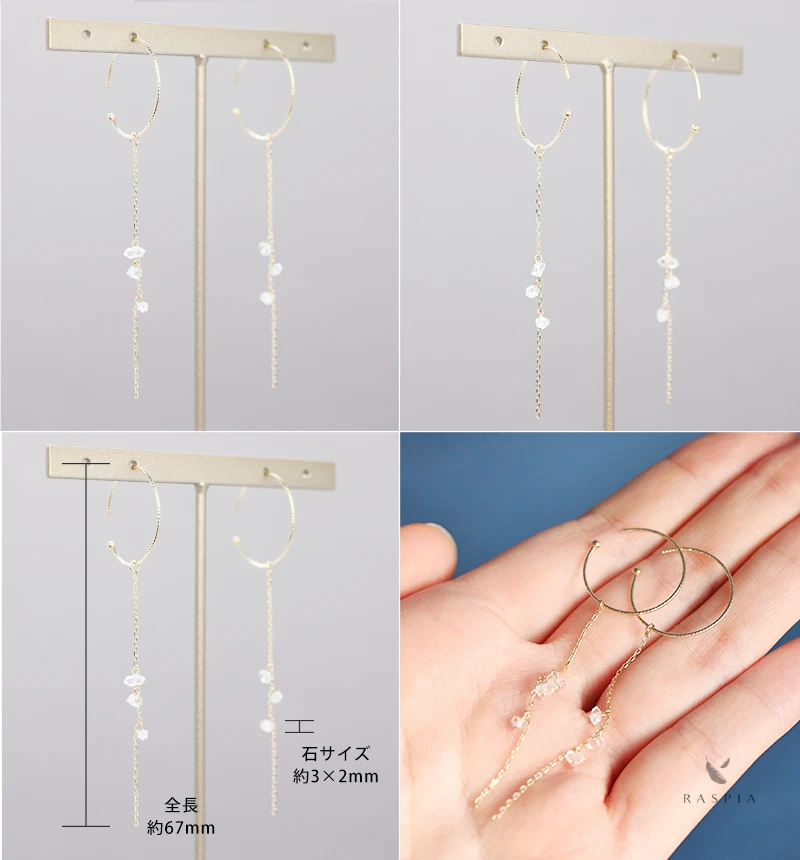 | サイズ | 【ピアス】サイズ:直径 20mm ポストの太さ 0.7mm【石】ハーキマーダイヤモンド:約2mm×3mm【チェーン】長さ 約50mm【チャーム丸カン内径】約1.3mm | ||