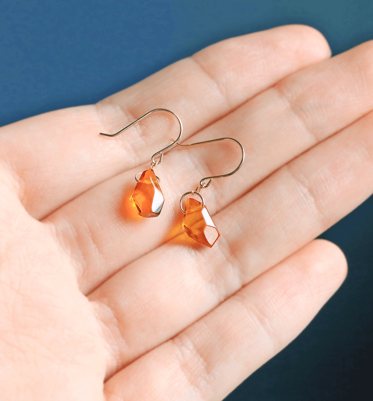 バルト海沿岸で採れる天然琥珀・バルティックアンバーを使用したフックピアスです。透明感があり、光に透かすとメイプルシロップやウイスキーのような深い色合いが見られます。