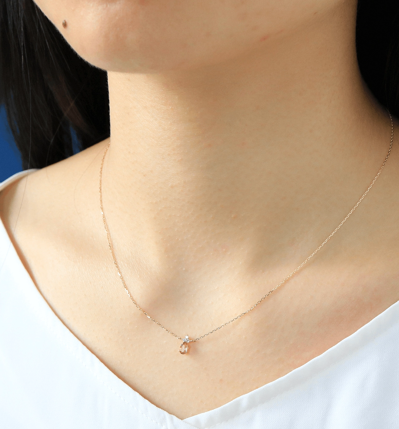 上部に3つのダイヤモンドをあしらったデザインで、小さく繊細でありながら胸元で確かな存在感を発揮します。