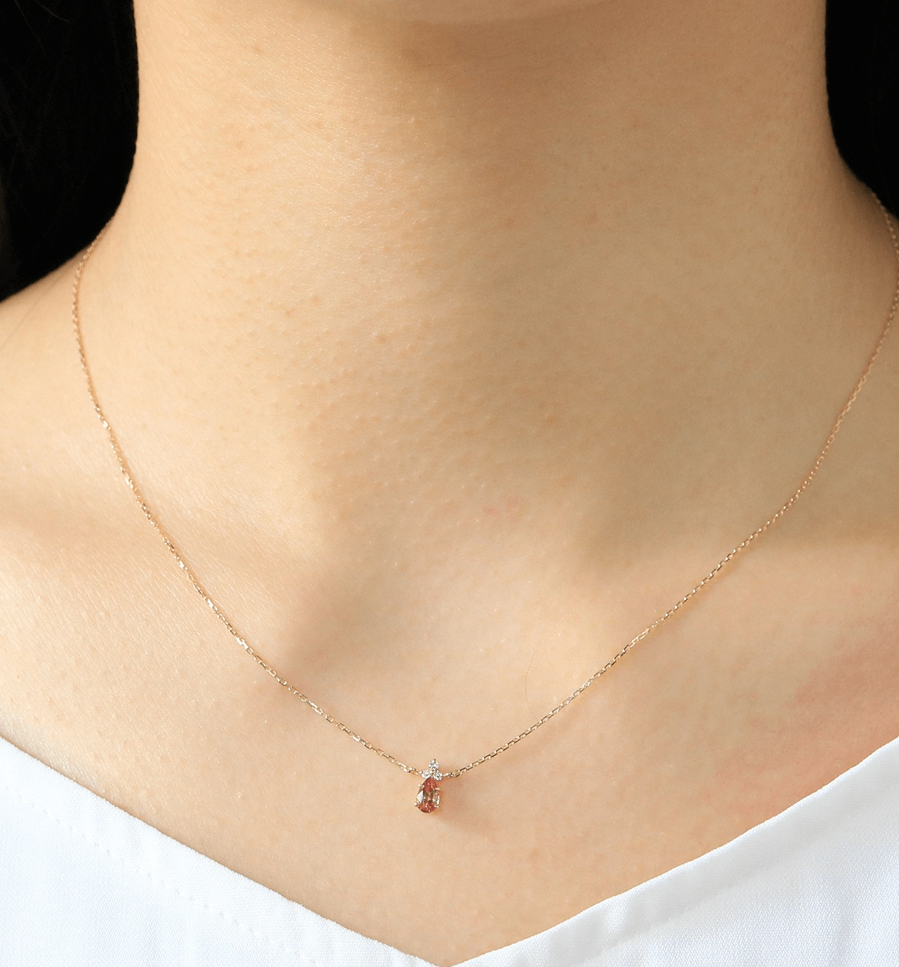 ネックレストップの石留めは、極限まで小さくさり気ない作りにこだわりました。小さいながらもしっかりと石を支え、宝石の存在感を引き立てます。