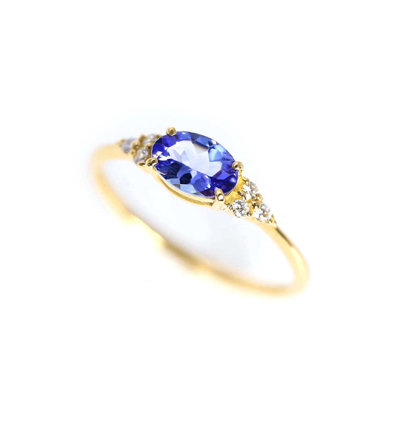 タンザナイトのオーバルカットをメインに、6つのメレダイヤを左右にセットしたK18リングです。タンザニアのメレラニ鉱山でのみ産出される「タンザナイト」は、 特有のパープルブルーが魅力的な人気の宝石です。また12月の誕生石です。