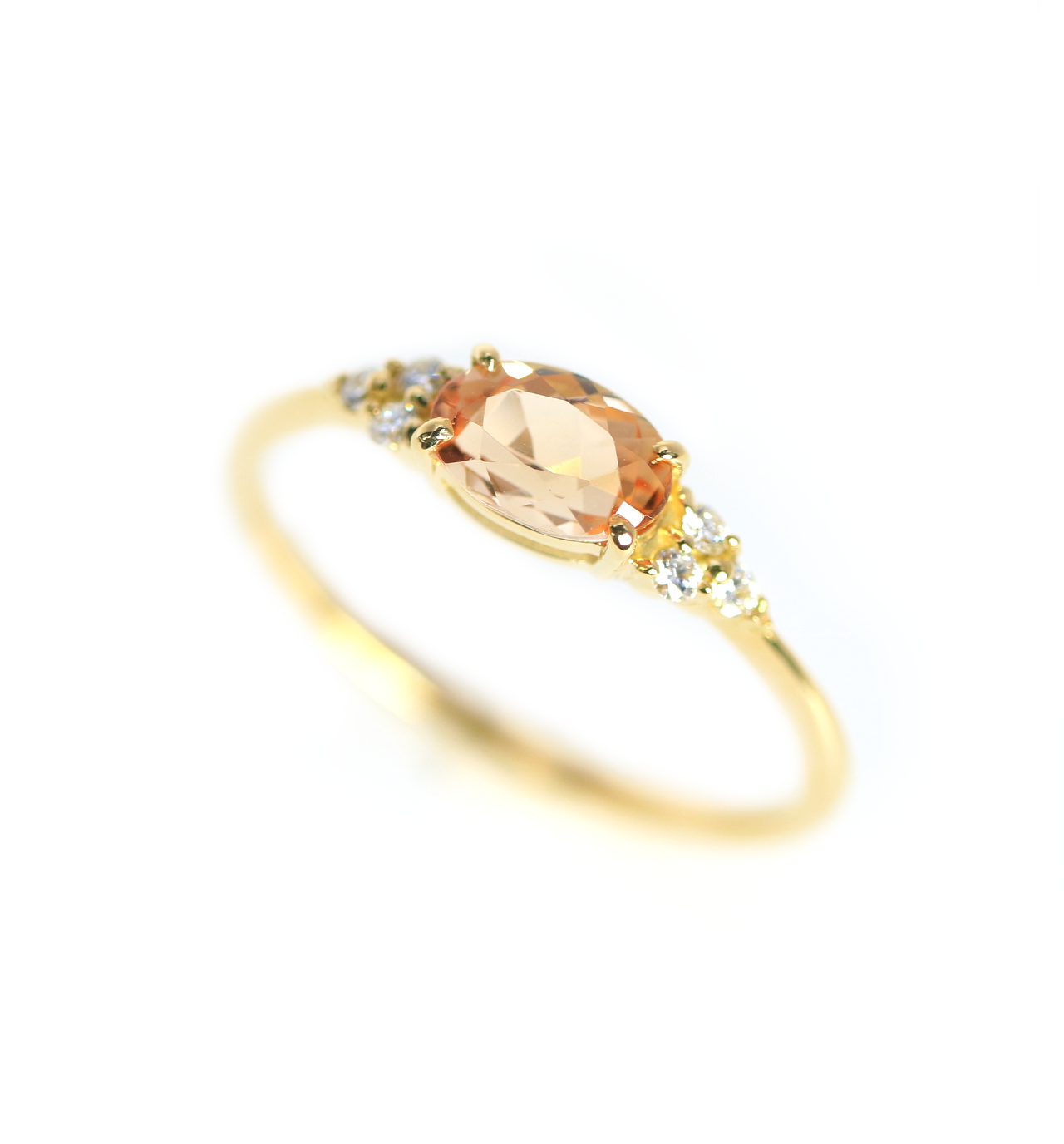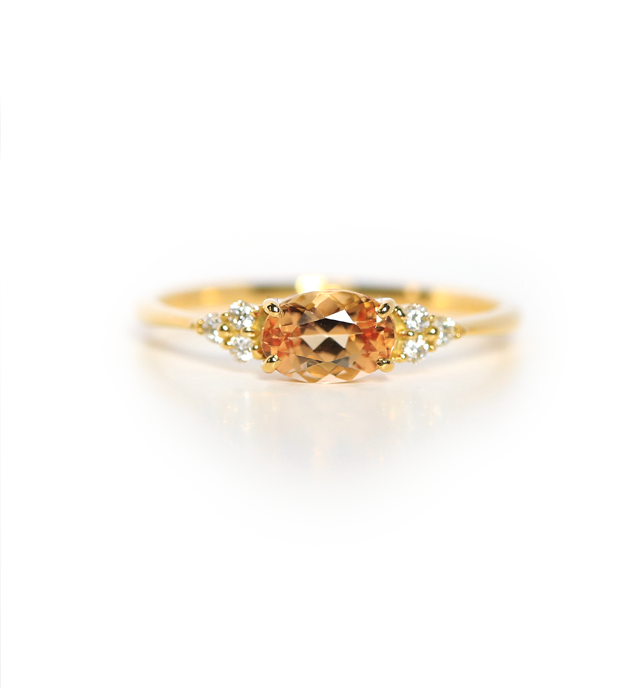 インペリアルトパーズのオーバルカットをメインに、6つのメレダイヤを左右にセットしたK18リングです。インペリアル(皇帝)の名が付けられた特別なトパーズは、シェリー酒カラーが上質な品質の宝石として人気です。トパーズは11月の誕生石です。