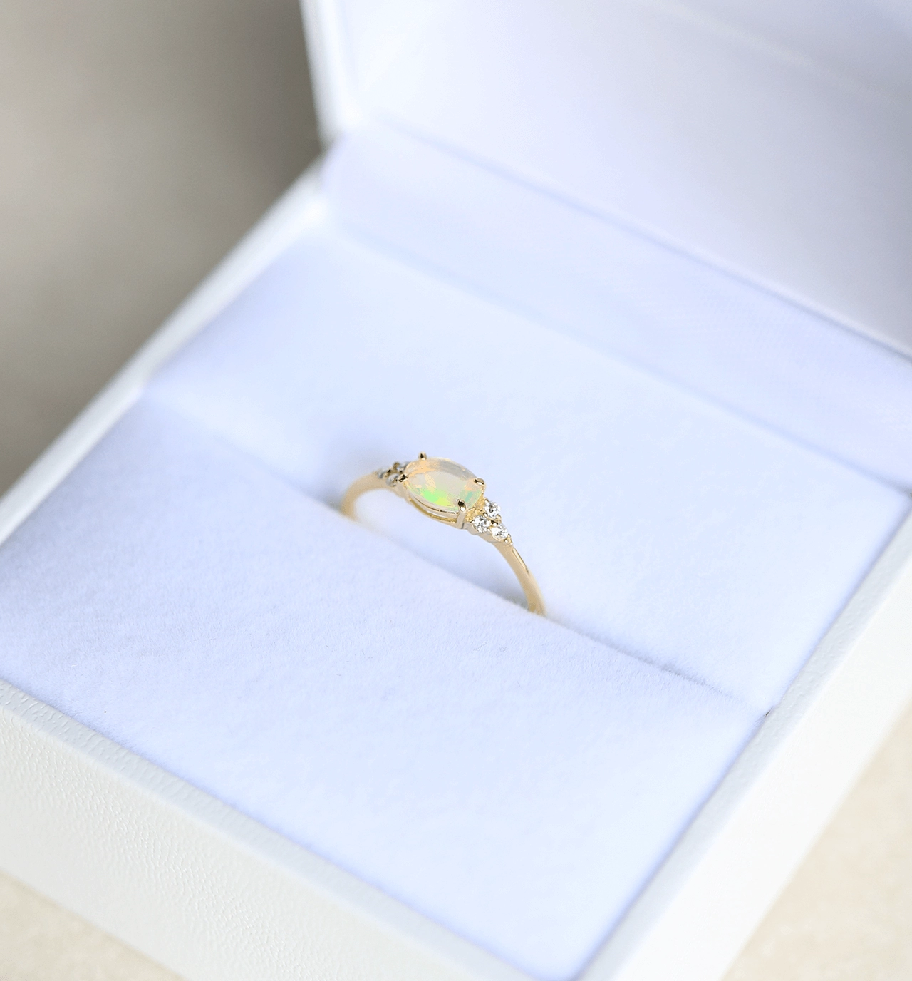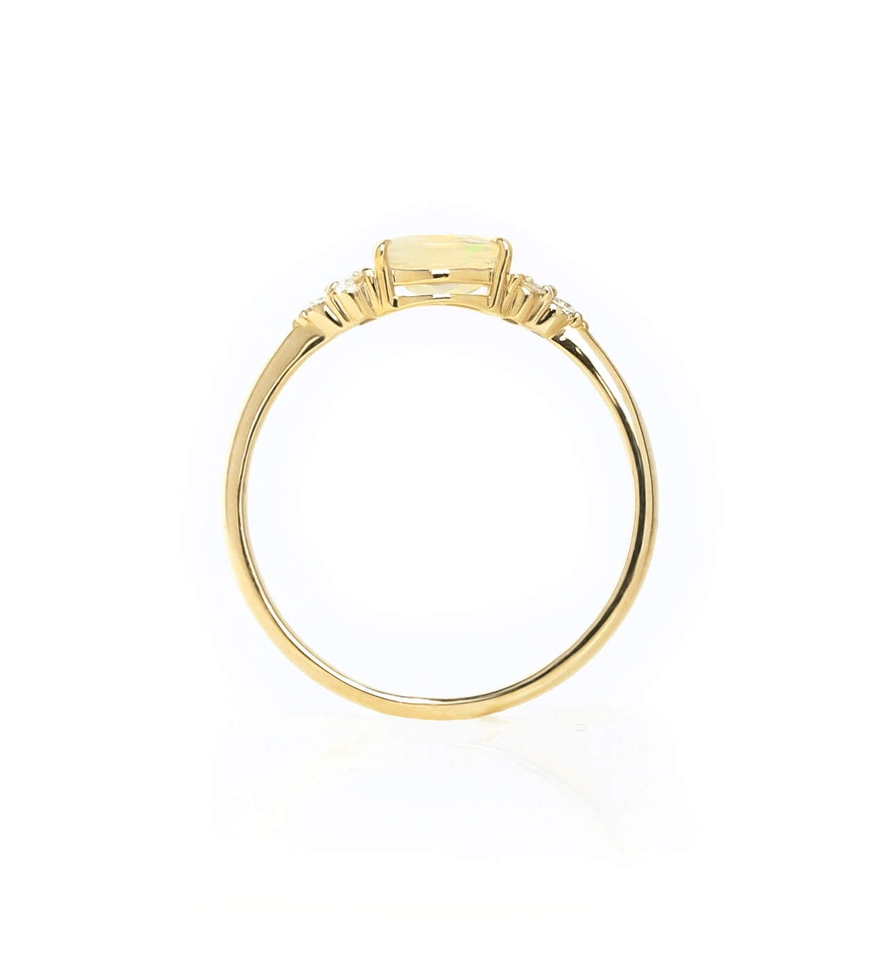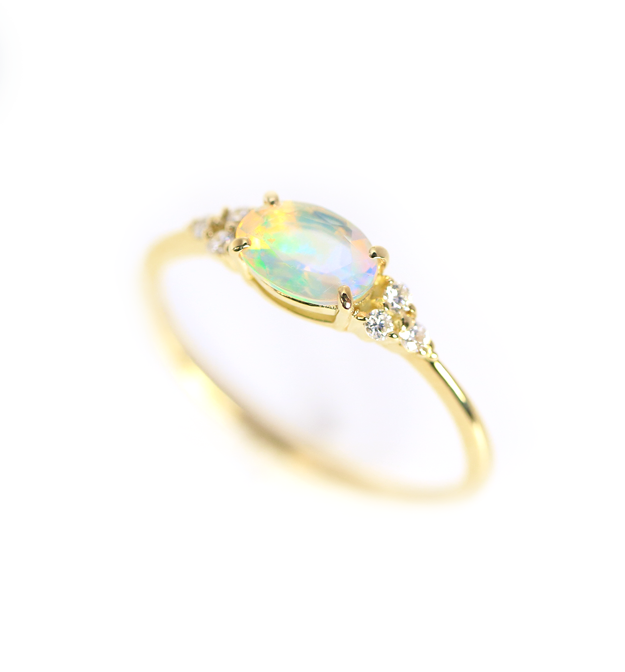 プレシャスオパールのオーバルカットをメインに、6つのメレダイヤを左右にセットしたK18リングです。エチオピア産の高品質な「プレシャスオパール」のカット面から様々な色が織りなす遊色がお楽しみいただけます。オパールは10月の誕生石です。