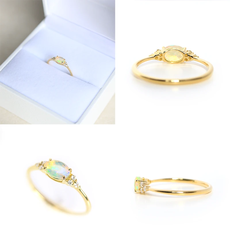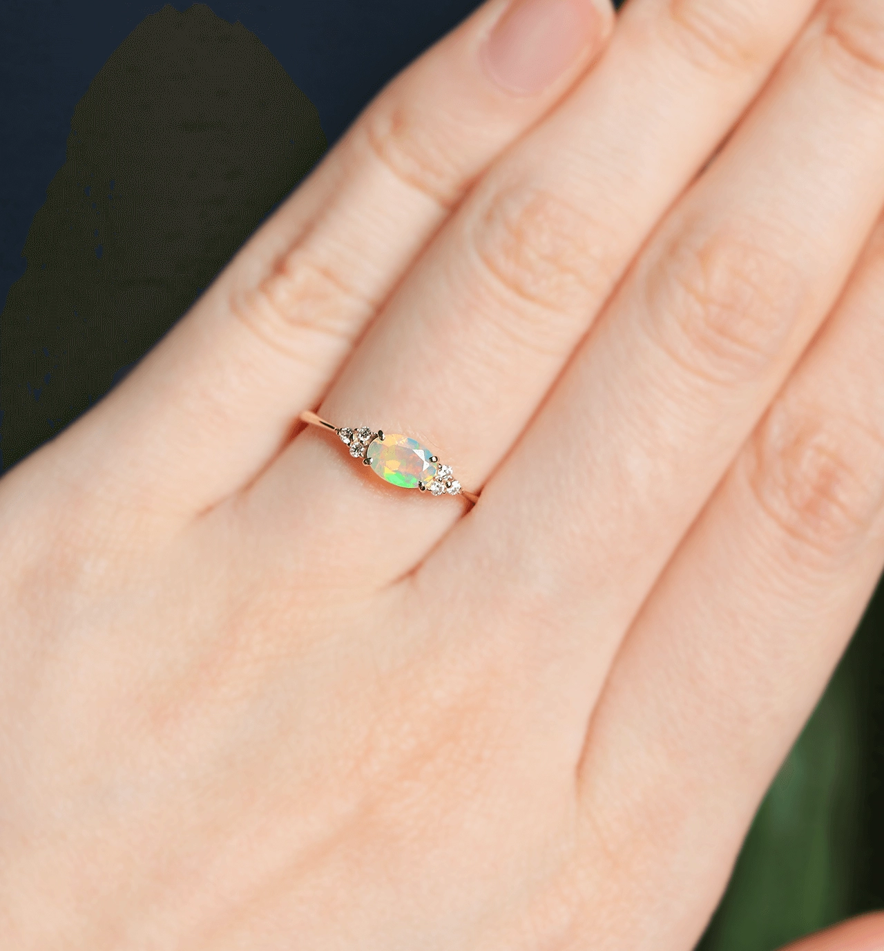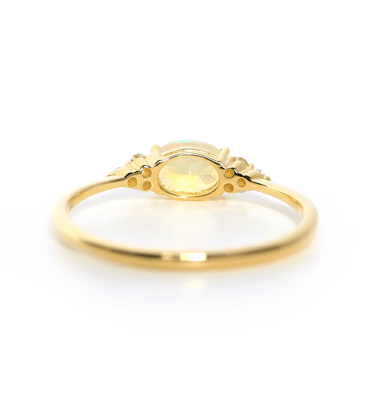 プレシャスオパールのオーバルカットをメインに、6つのメレダイヤを左右にセットしたK18リングです。エチオピア産の高品質な「プレシャスオパール」のカット面から様々な色が織りなす遊色がお楽しみいただけます。オパールは10月の誕生石です。