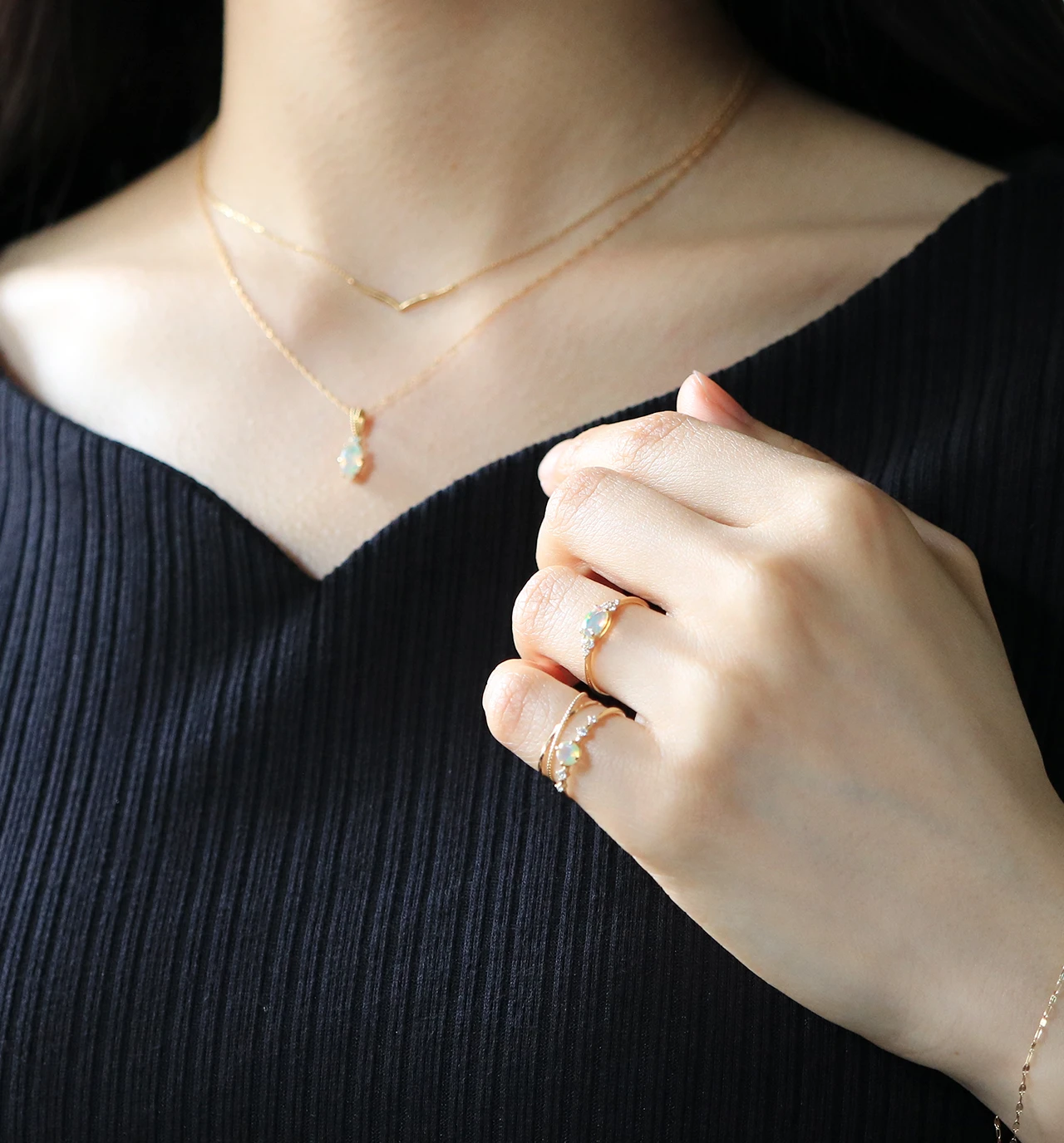 | 石 | 【個数】 ・プレシャスオパール × 1石(エチオピア産) ・ダイヤモンド × 6石(SI~VSクラス相当) 【サイズ】 ・プレシャスオパール:約 4mm × 6mm × 1石 ・ダイヤモンド:直径 約 1.3mm × 6石 【カラット】 ・プレシャスオパール:約 0.45ct × 1石 ・ダイヤモンド:0.01ct × 6石 |