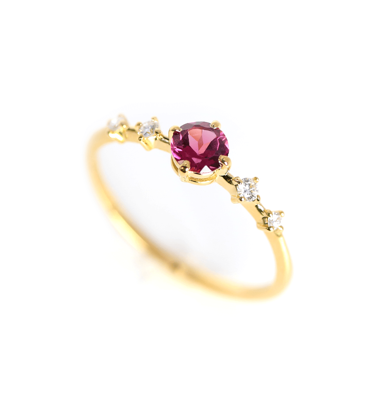 ロードライドガーネットのラウンドカットをメインに、4つのメレダイヤを配したリングです。バラの花びらのようなワインレッドカラーが魅力的なロードライトガーネットは、1月の誕生石としても有名です。