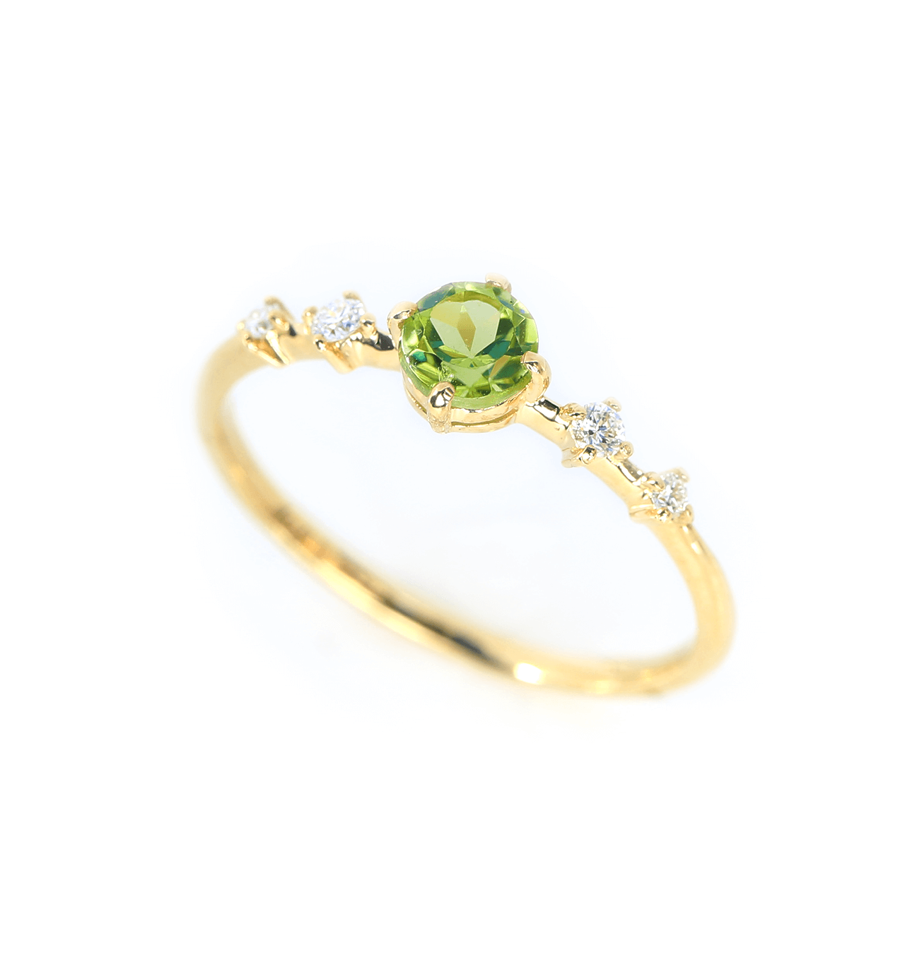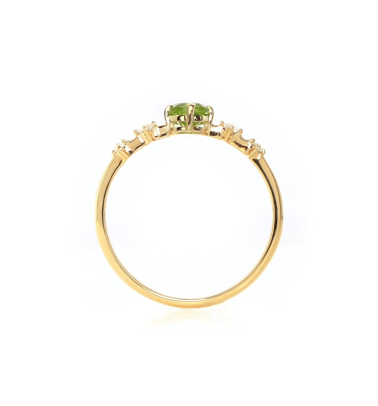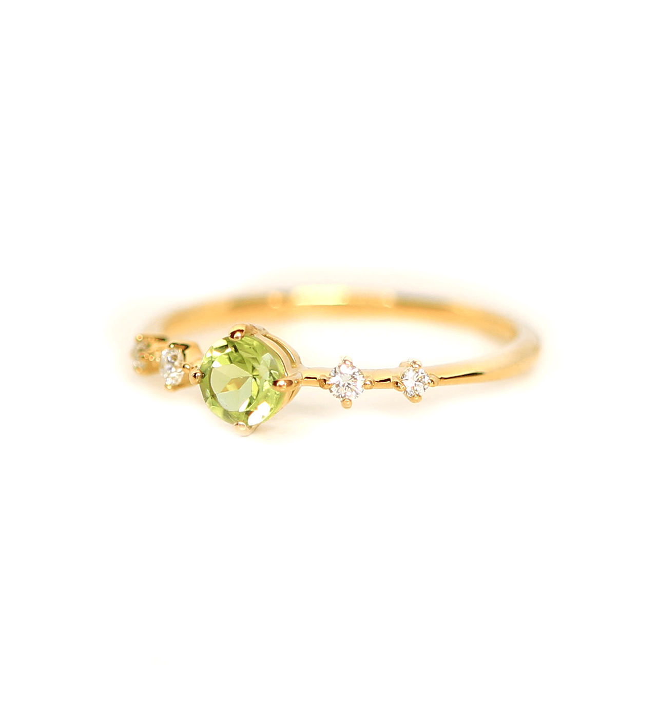 ペリドットのラウンドカットをメインに、4つのメレダイヤを配したK18リングです。