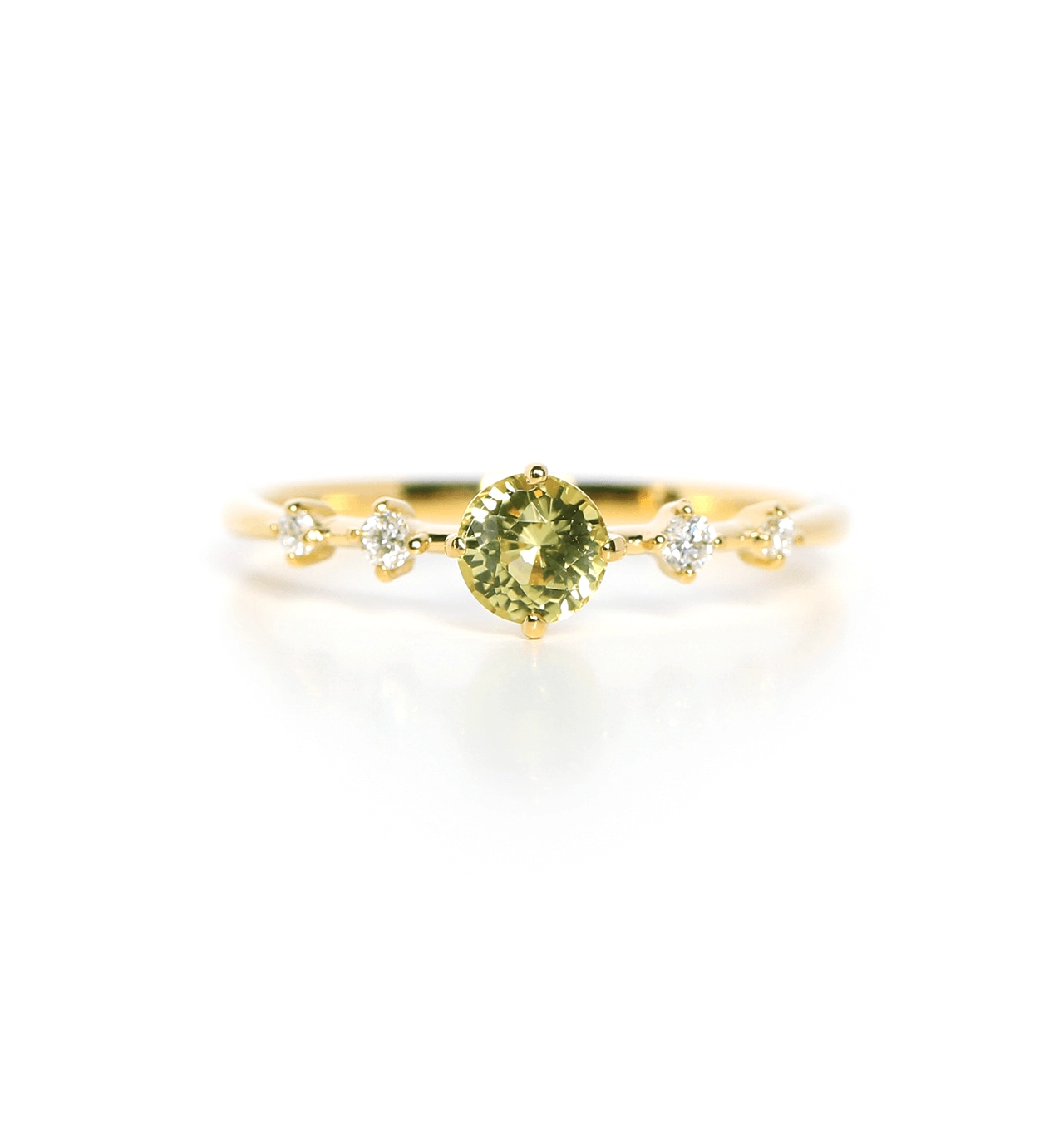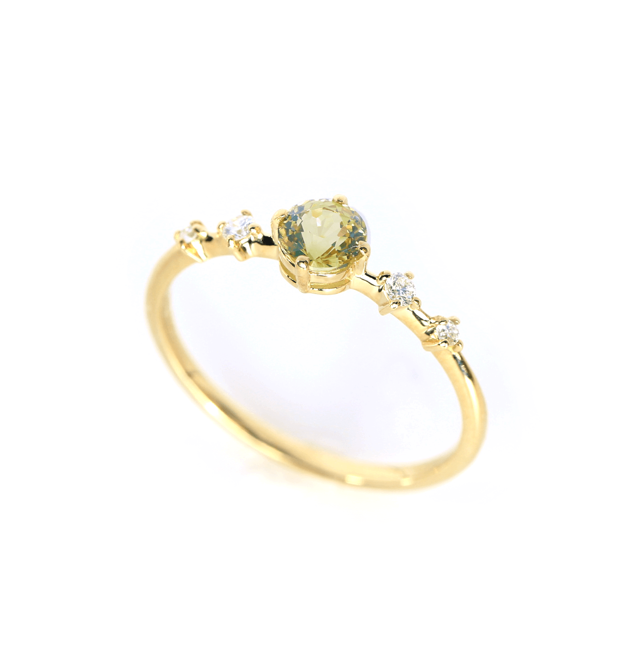 クリソベリルのラウンドカットをメインに、4つのメレダイヤを配したK18リングです。特有のイエローゴールドと強い輝きと美しい煌めきが魅力的な宝石です。
