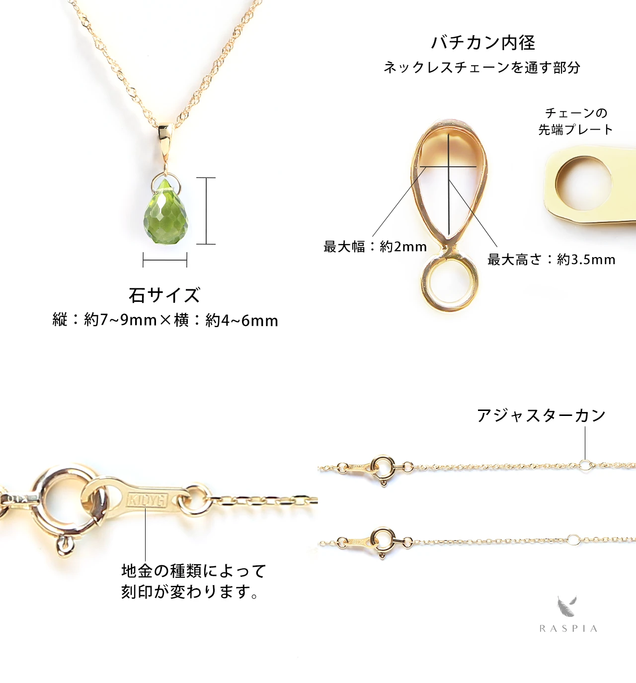 RASPIA(ラスピア)は、シンプルで大人可愛いデザインをイメージし、カラーストーン/天然石とK10(10金)/K18(18金)の本物のゴールド素材を使って手作りしています。