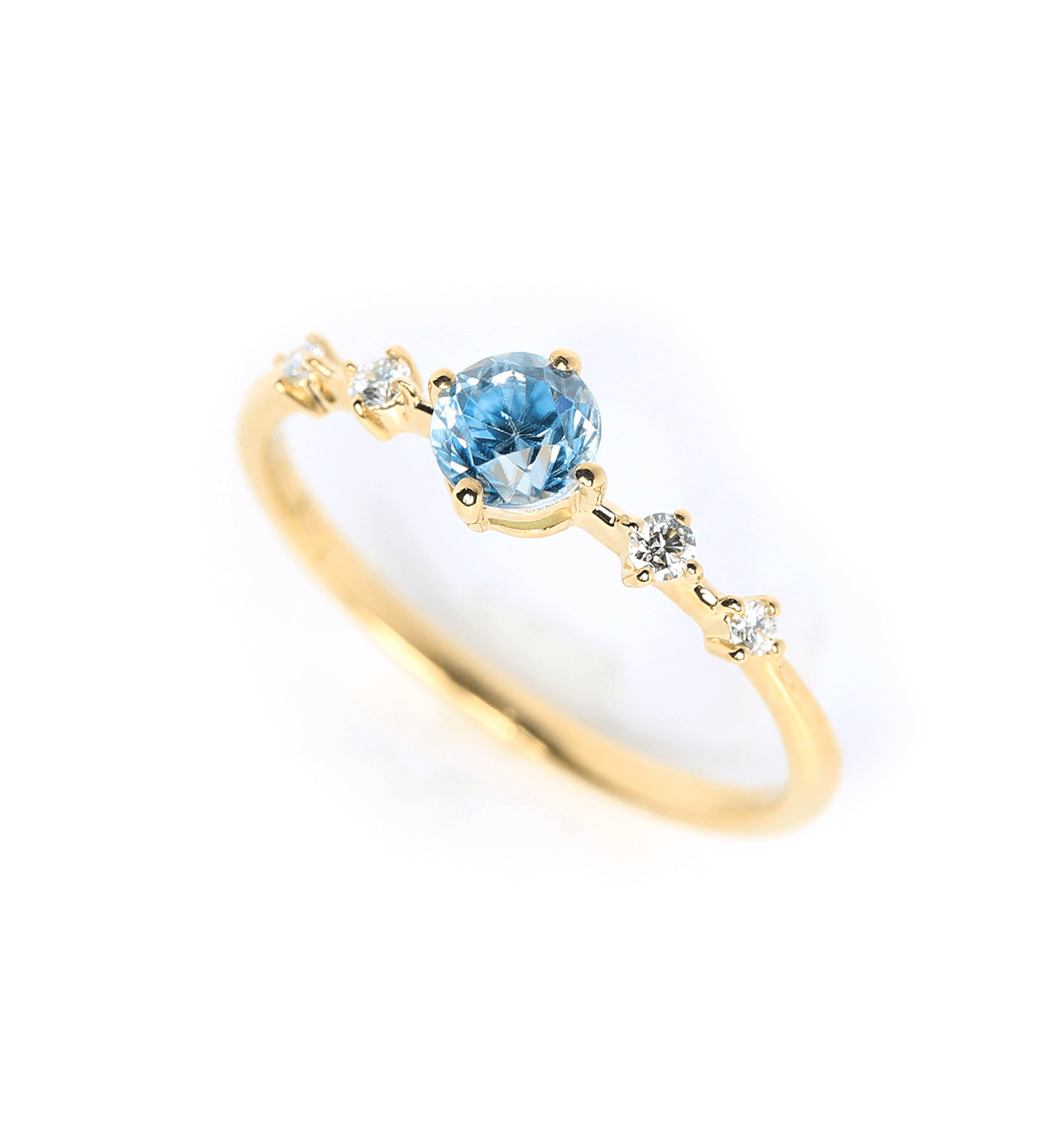ブルージルコンのラウンドカットをメインに、4つのメレダイヤを配したK18リングです。 ジルコンは特有の高い屈折率と分散値による虹色のファイアと呼ばれる輝きが見られます。澄み切った淡青の色彩とファイアがとても美しい宝石です。