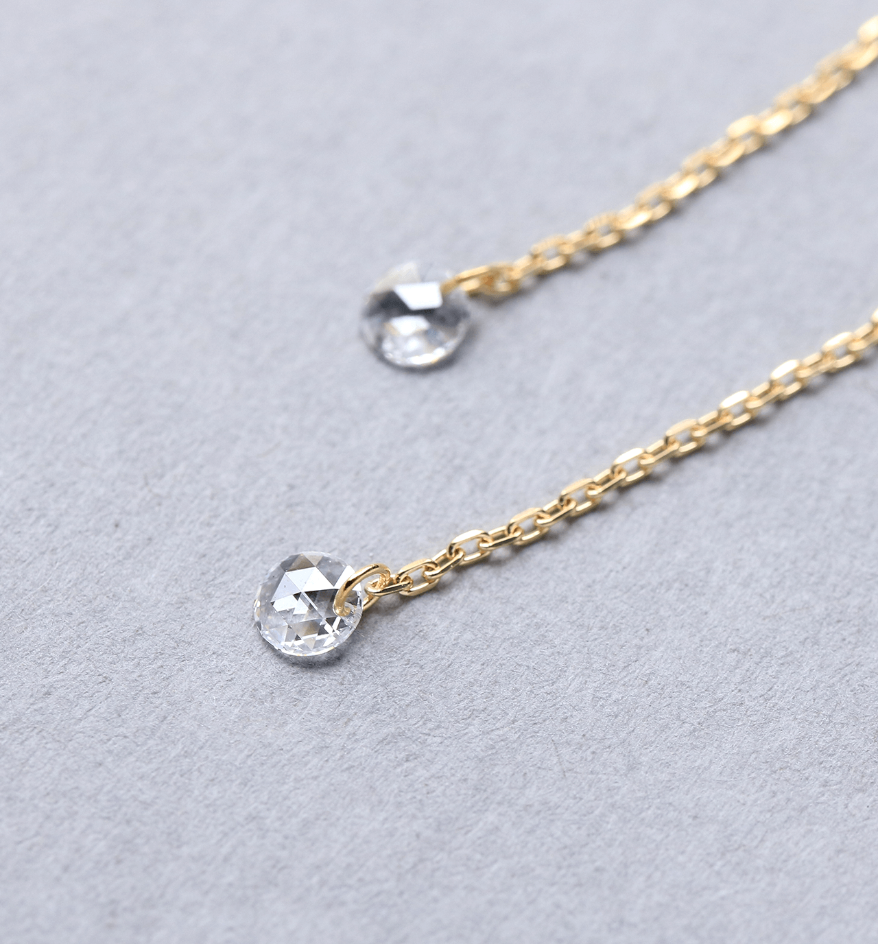 石が主役の繊細な曲線が美しいアメリカンチェーンを使ったイエローゴールドピアス。耳元でゆらゆらきらめくローズカットのダイヤモンドは、エレガントなコーディネートや普段使いとしても使いやすいピアスです。 ウェーブの入ったパーツとローズカットのダイヤモンドの輝きを、極細の18金チェーンが際立たせています。