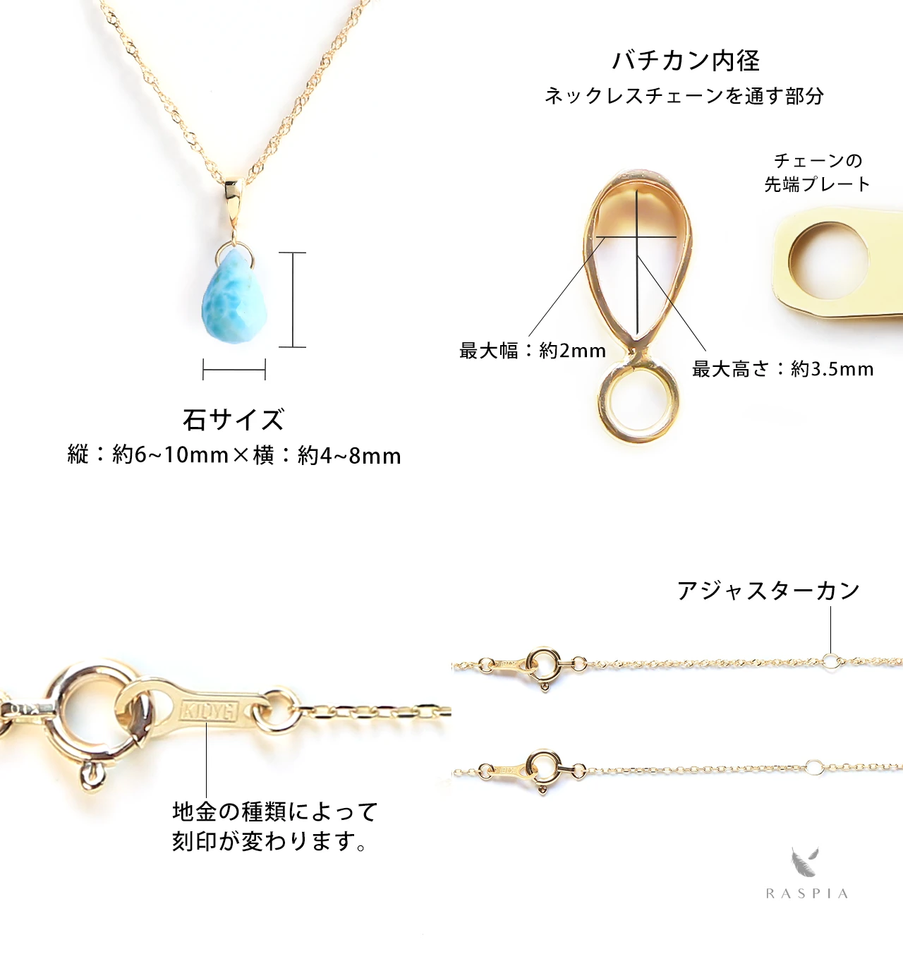 | サイズ | ラリマー:縦 約 6~10mm × 横 4~8mm バチカン内径:高さ 最大(約)3.5mm/幅 最大(約)2mm チェーン全長は40cm・45cm・50cmよりお選びいただけます。 | ||