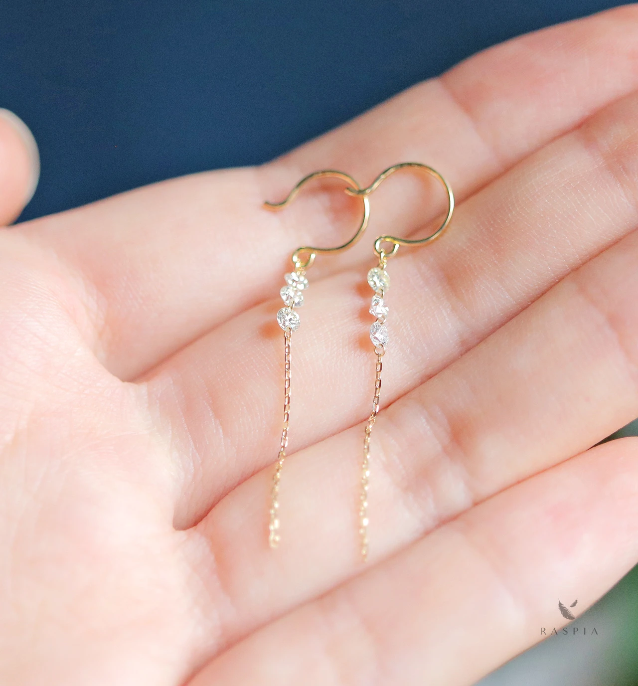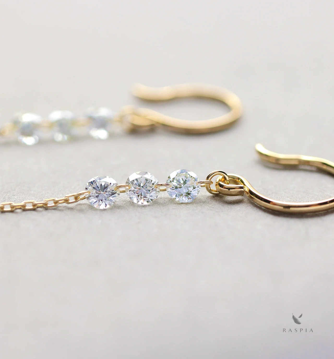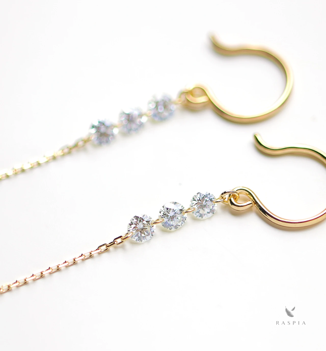 ブリリアントカットのダイヤモンドを左右で合計6粒あしらったチェーンフックピアスです。