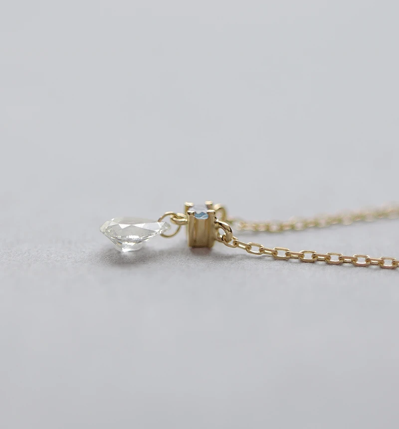 小さなアクアマリンにペアシェイプのダイヤモンドが特徴のK18ネックレス。