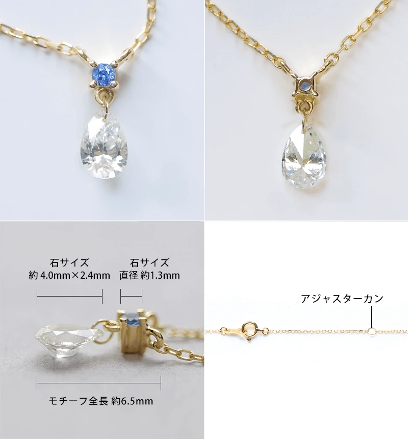 小さなサファイアにペアシェイプのダイヤモンドが特徴のK18ネックレス。
