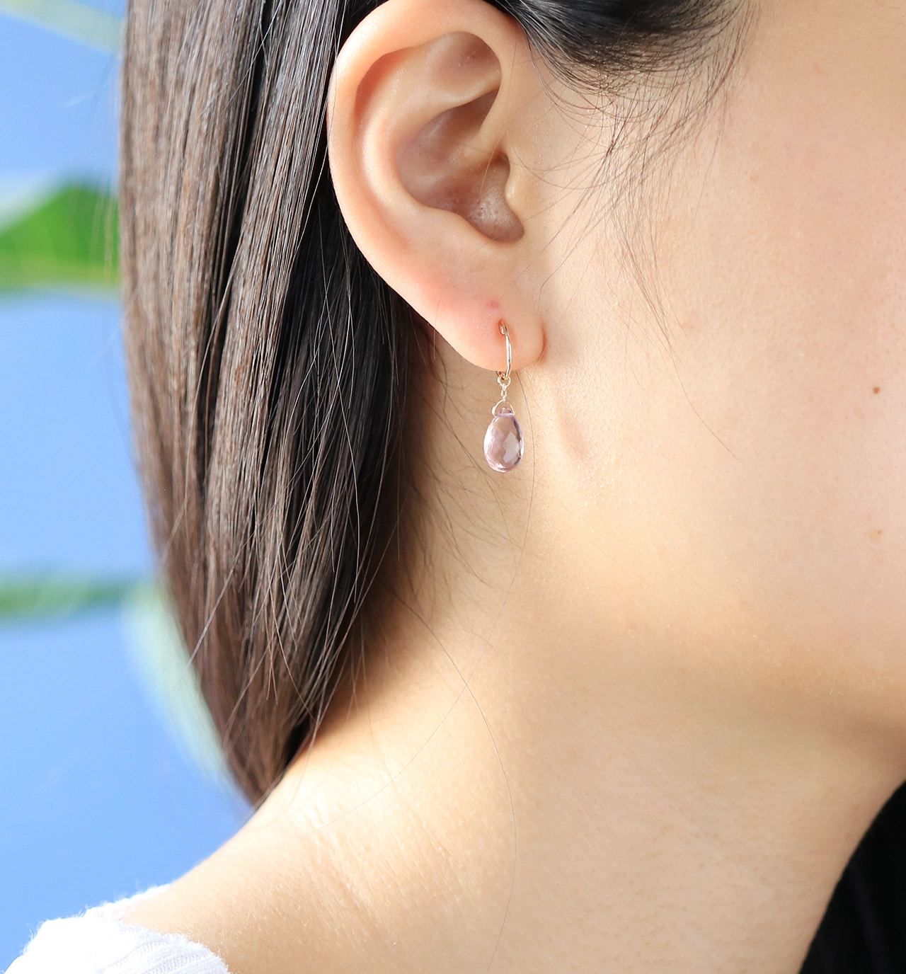 イヤリングと石のつなぎには極細な10金チェーンを使用し、石の魅力が最大限に引き立つようにしました。