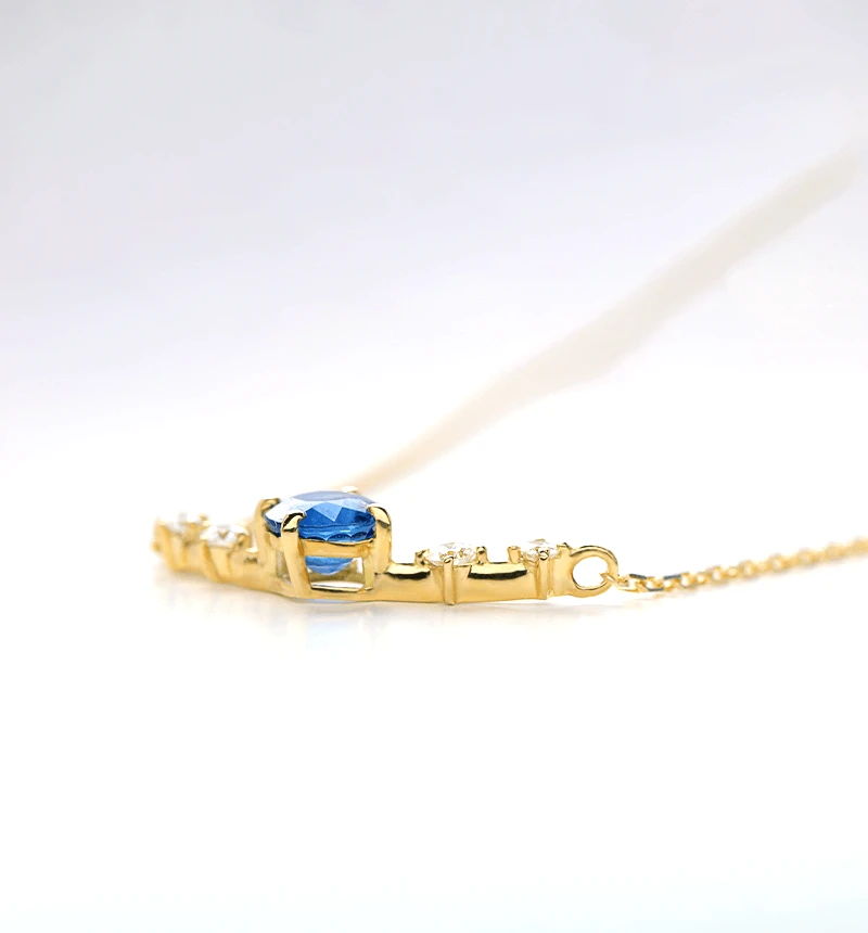 マダガスカル産のブルーカラーが美しいサファイアのラウンドカットをメインに、4つのメレダイヤを配したK18ネックレスです。 3大宝石の一つとして、有名なサファイア。澄み切ったブルーは美しく人々を魅了してきた宝石です。