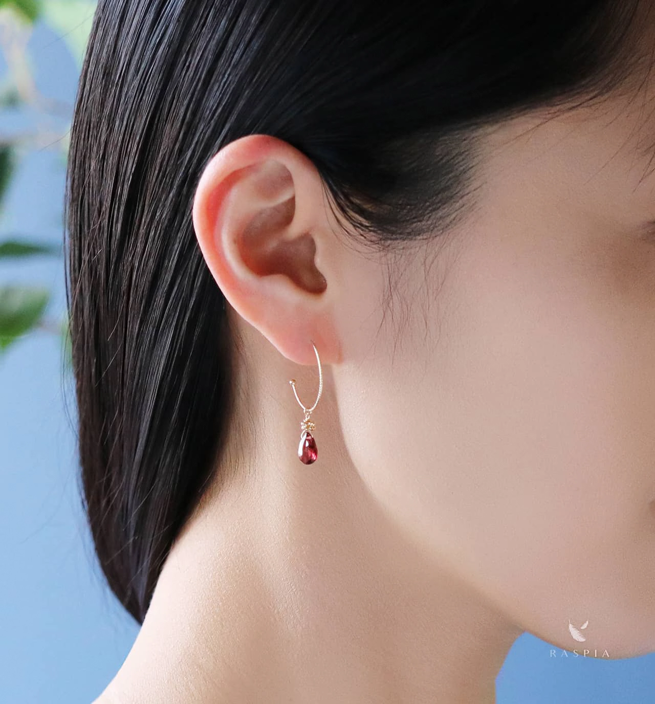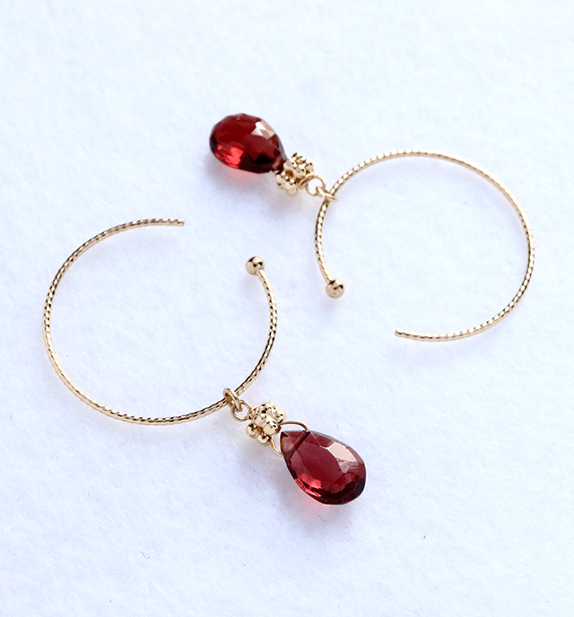 金属部分はK10パーツを使うことでより石に目が行くように工夫されています。 アルマンディンガーネットの深い赤色は大人の女性の魅力をより引き立たせ、アクセントの透明の輝きでピュア感もプラス。 フックとチャームは取り外し可能です。