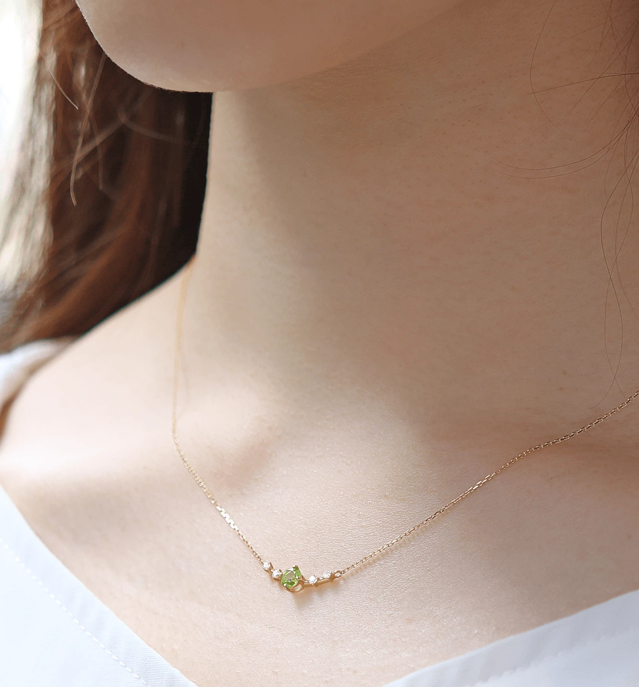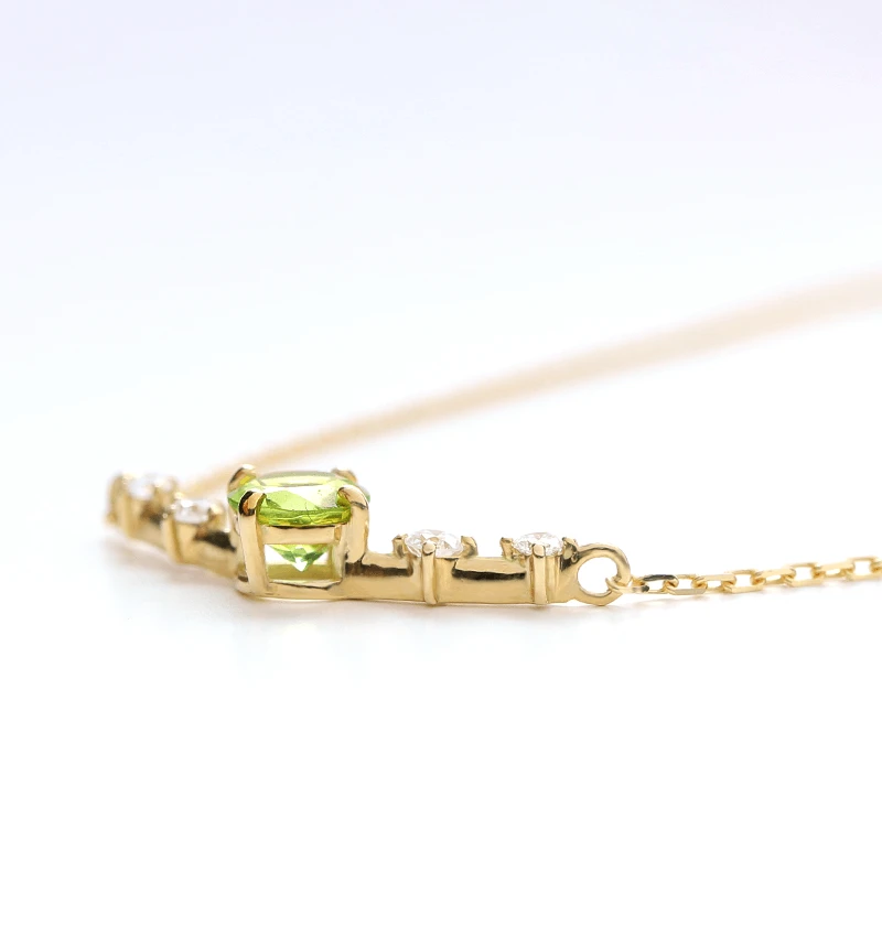 オリーブグリーンが美しいペリドットを使ったK18ネックレス。古代エジプトではペリドットは暗闇を照らす「太陽の石」と呼ばれ崇められていました。カラー、カット・研磨の質、透明度など、美しいルースを1粒ずつ厳選して買付しております。