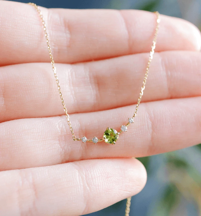ペリドットのラウンドカットをメインに、4つのメレダイヤを配したK18ネックレスです。
