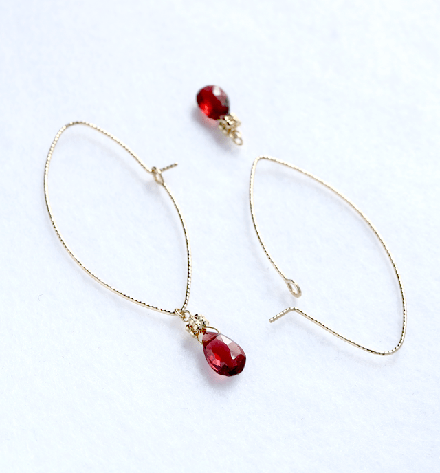 金属部分はK10パーツを使うことでより石に目が行くように工夫されています。 アルマンディンガーネットの深い赤色は大人の女性の魅力をより引き立たせ、アクセントの透明の輝きでピュア感もプラス。 フックとチャームは取り外し可能です。