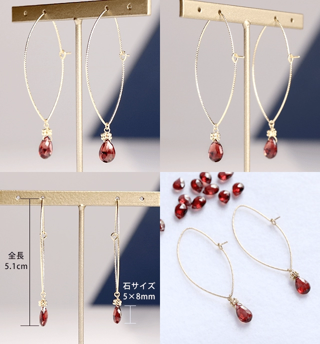 | サイズ | 【ピアス】サイズ:縦 約40mm×横 約19mm ポストの太さ 0.7mm【石】アルマンディンガーネット:約8mm×5.5mm【チャーム丸カン内径】約1.3mm | ||