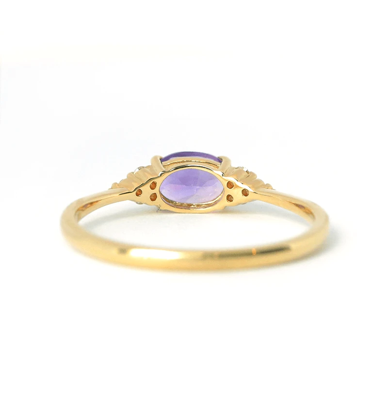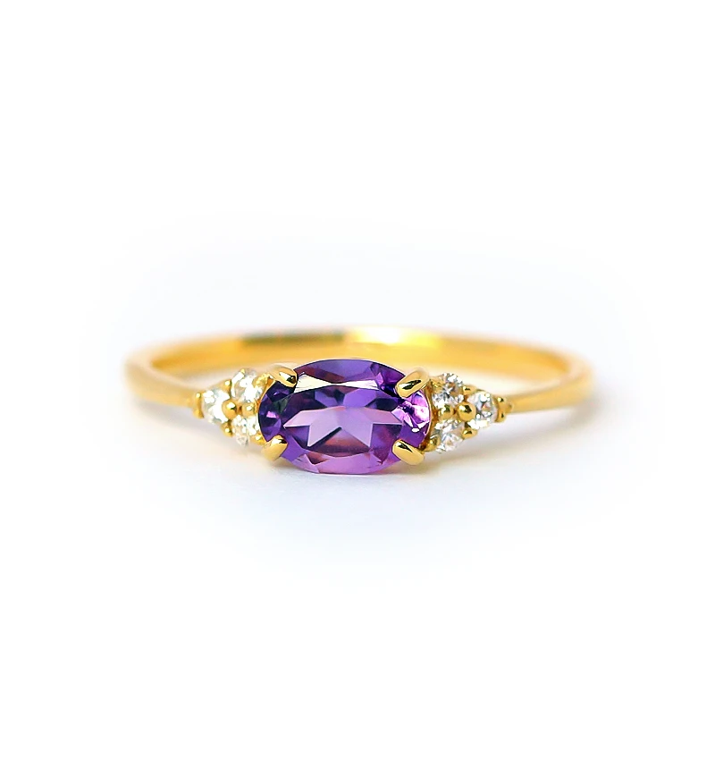 アメジストのオーバルカットをメインに、6つのメレダイヤを左右にセットしたK18リングです。鮮やかで濃厚なパープルカラーが美しいアメシストは人気の宝石です。また2月の誕生石です。