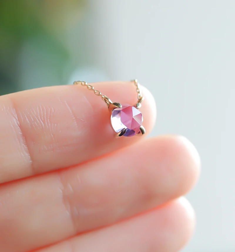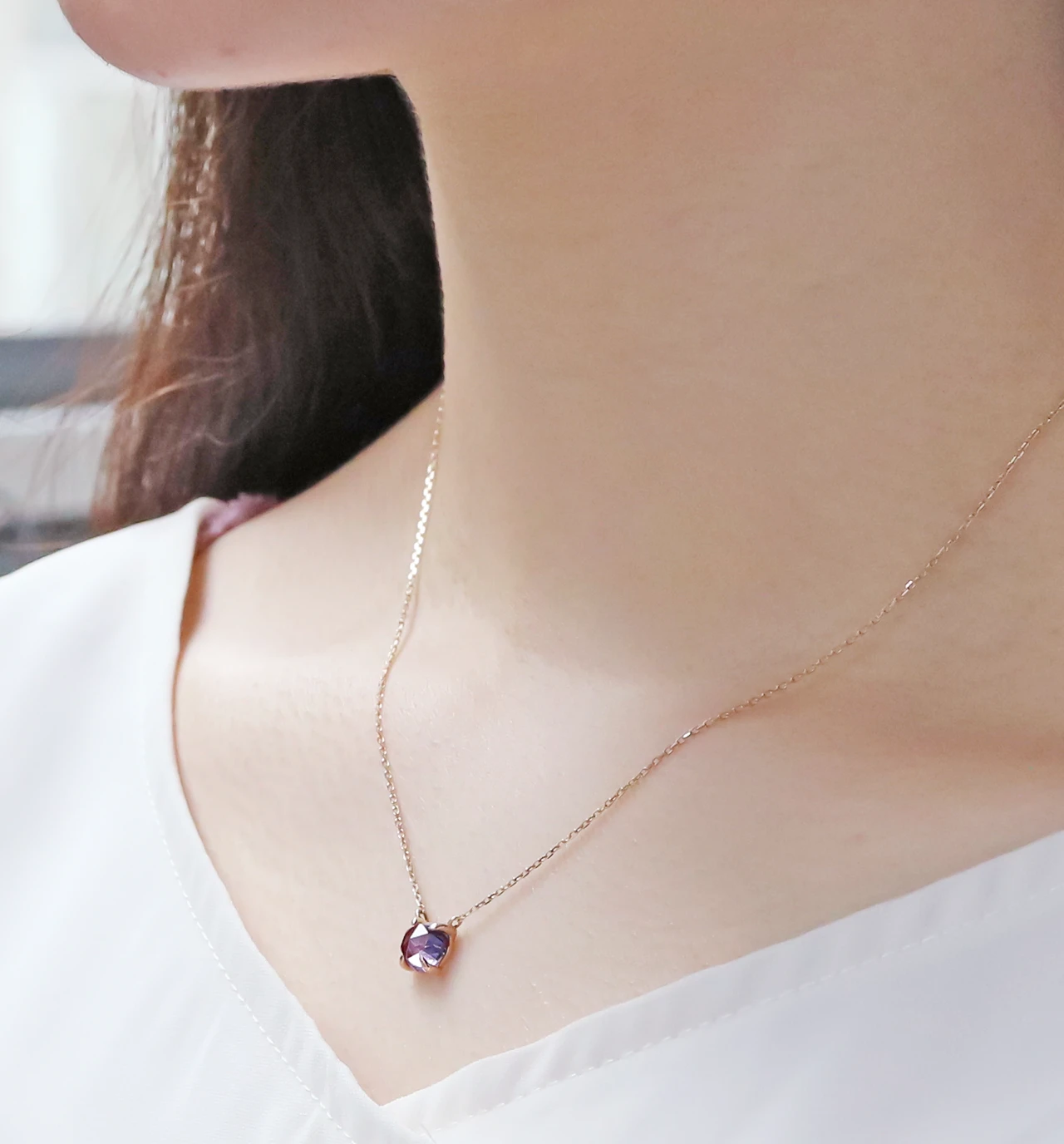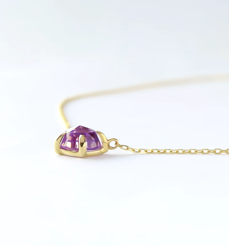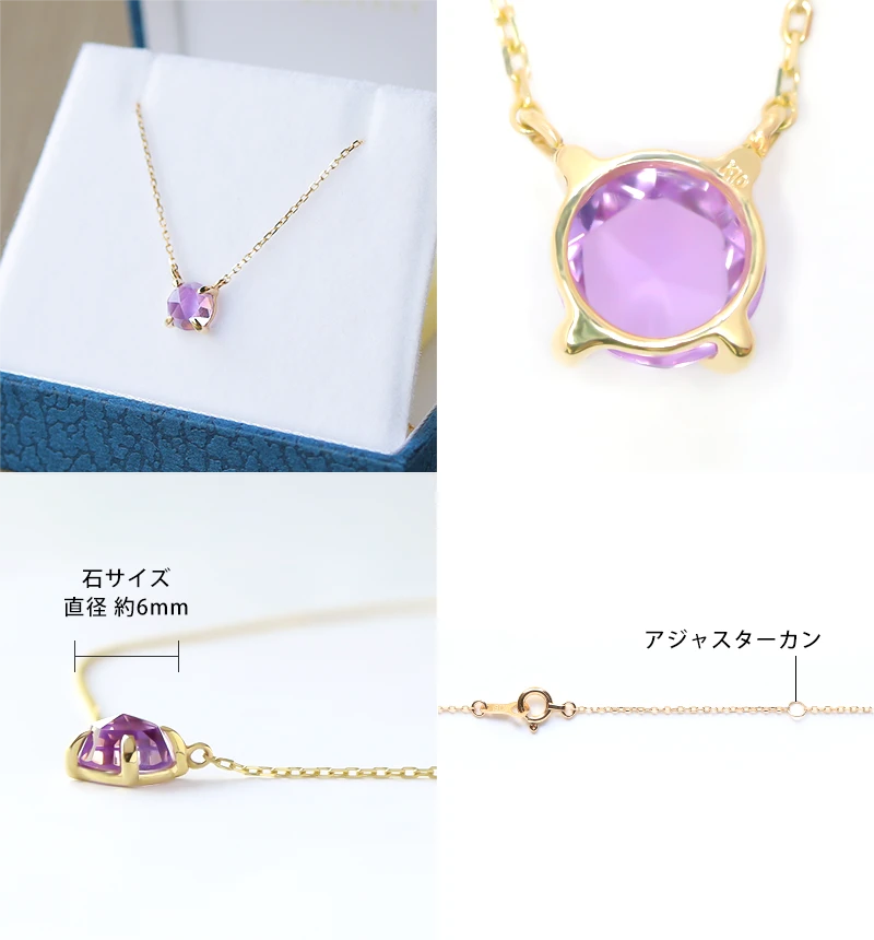 鮮やかなパープルカラーが美しいローズカットのアメジストを使用したK10ネックレスです。ローズカットの表面に施された24面のカット面が光を反射し、キラキラと美しく輝きます。アメジストは2月の誕生石です。