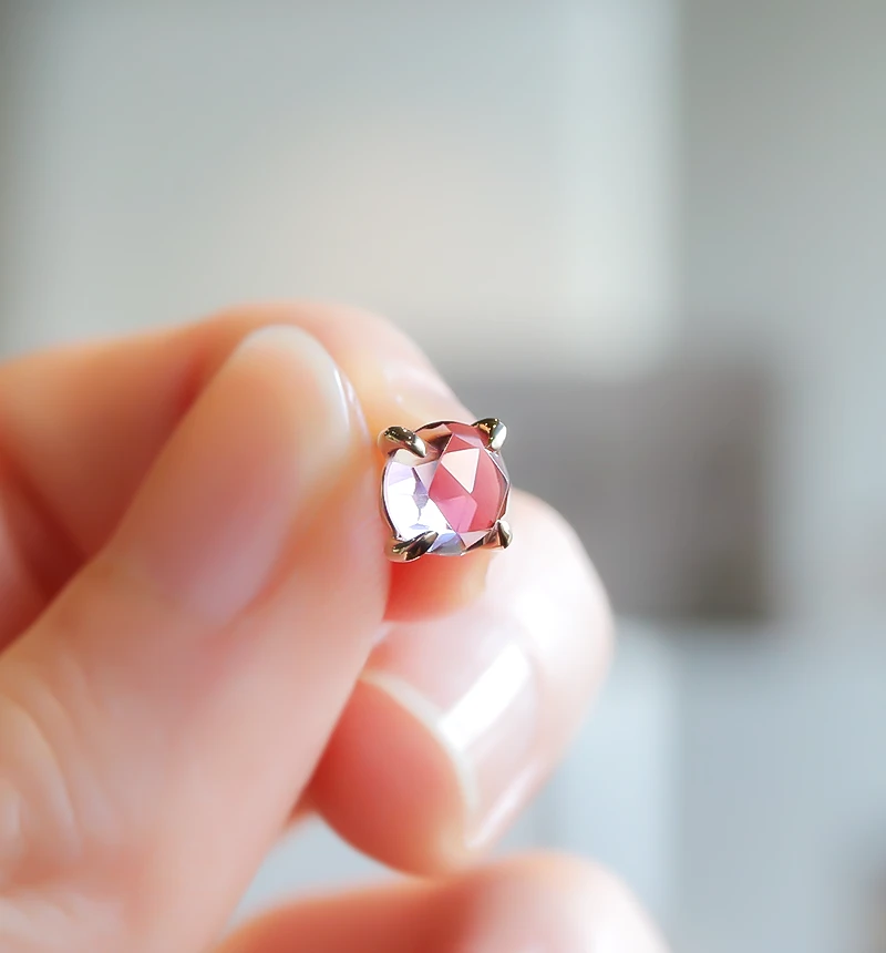 洗練された美しい爪にローズカットのカラーストーンが主役のピアスです。ドーム型の表面に多数の三角形のカットが施されたカットは、薔薇の蕾(つぼみ)のような形のためローズカットと名付けられました。アンティークカットとしても有名です。