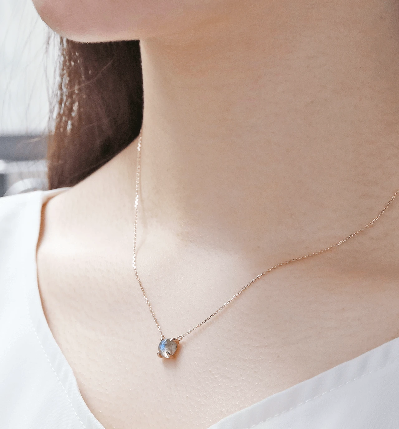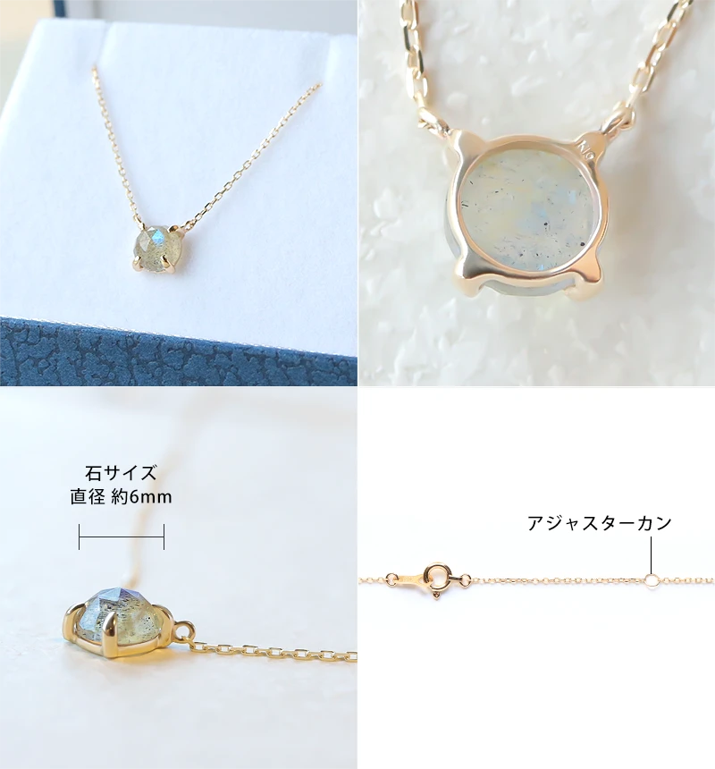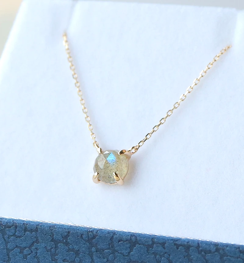 シラーと呼ばれる特有の輝きが美しい、ローズカットのラブラドライトを使用したK10ネックレスです。ローズカットの表面に施された24面のカット面が光を反射し、キラキラと美しく輝きます。
