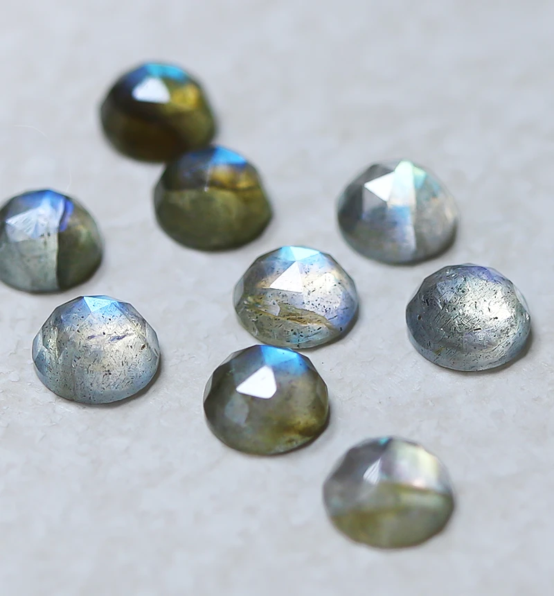 光の加減や見る角度によって、様々な色の輝きを見ることができ、その美しい色合いは蝶の羽やオーロラによく例えられます。この独特の輝きは「ラブラドレッセンス(ラブラドルの光)」と呼ばれています。その虹色 の遊色効果を生み出す原因は結晶の特定の面に平行に金属鉱物の微薄層が並んでいる事で、その層の境界で、光の分解が生じて虹色の光の模様となります。