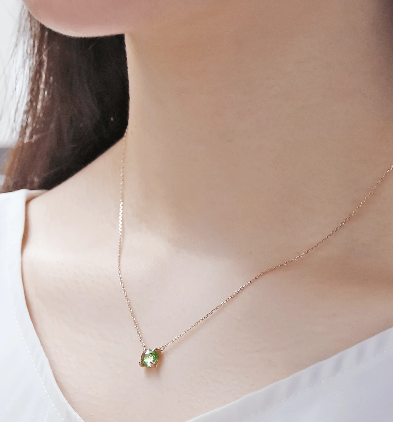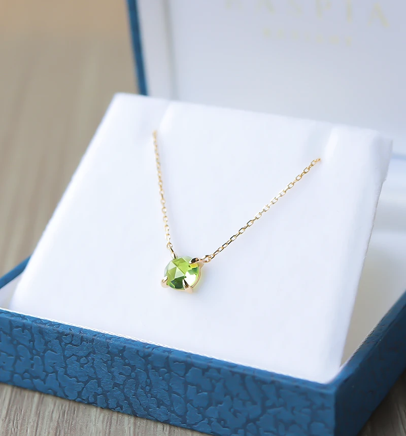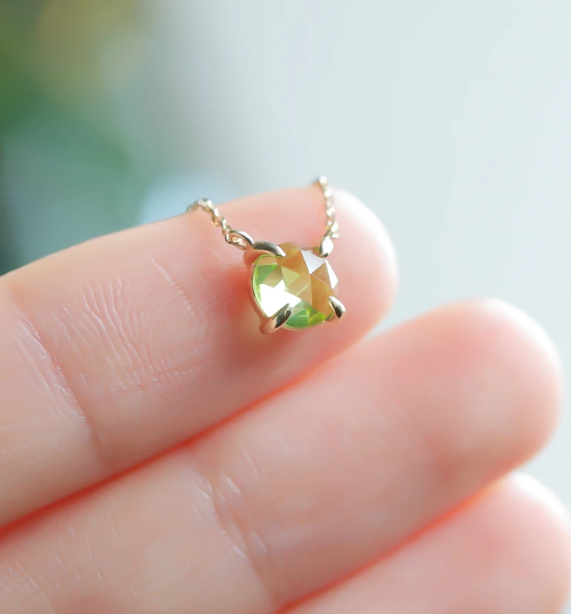 オリーブグリーンが美しいローズカットのペリドットを使用したK10ネックレスです。ローズカットの表面に施された24面のカット面が光を反射し、キラキラと美しく輝きます。ペリドットは8月の誕生石です。
