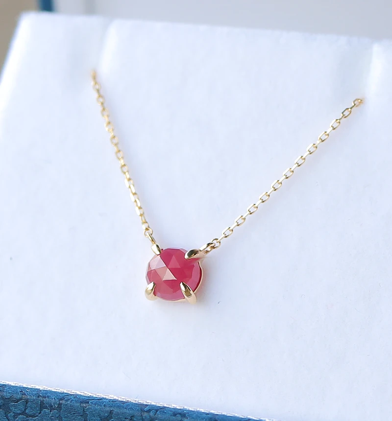 燃え盛る炎のように情熱的に輝くローズカットのルビーを使用したK10ネックレスです。ローズカットの表面に施された24面のカット面が光を反射し、キラキラと美しく輝きます。ルビーは7月の誕生石です。